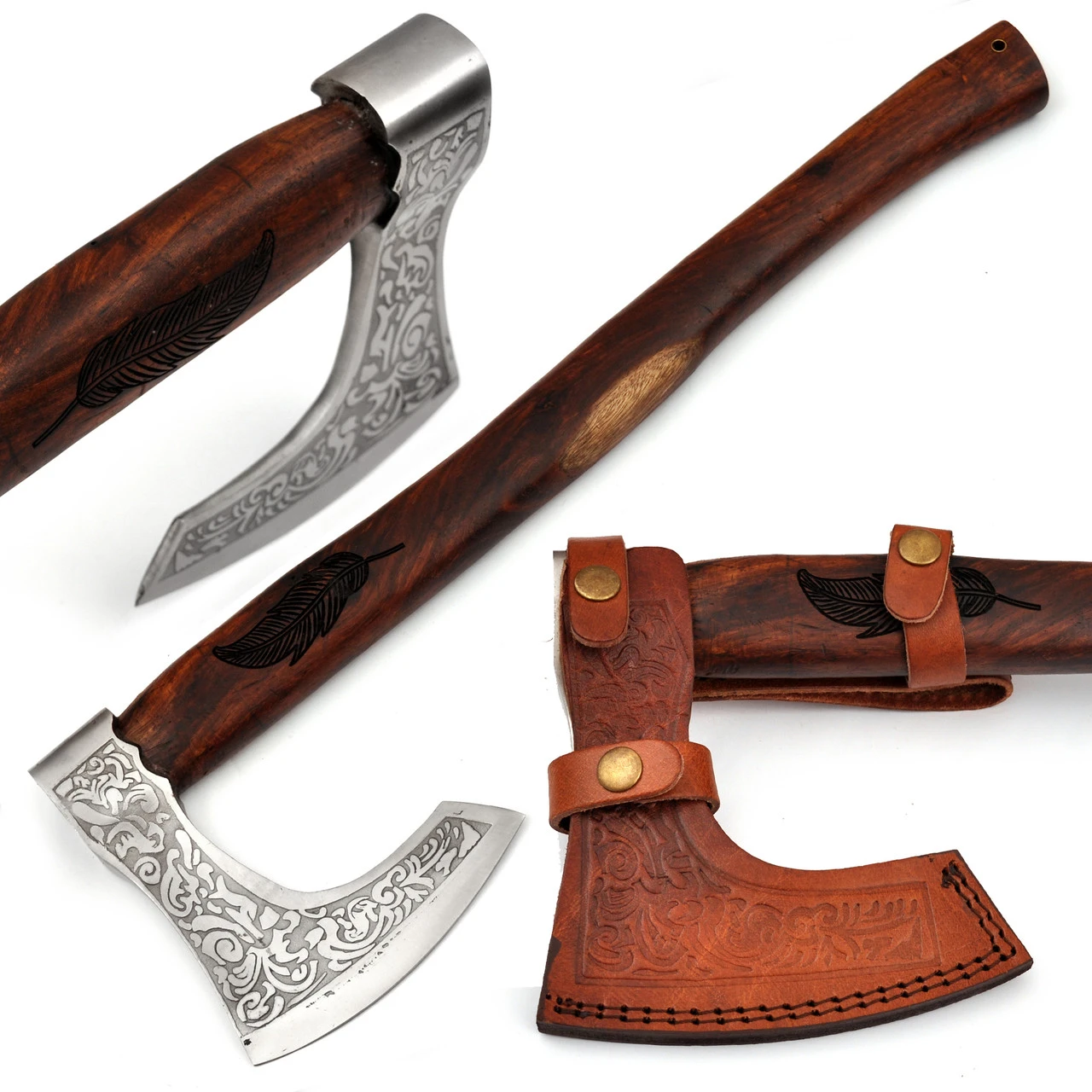 This particular Viking axe is known as a bearded axe because of its elongated lower edge and curved blade, which enabled downward blows. In battle, Vikings threw axes as though they were missiles, and used the lower portion of the axe blade to hook necks and ankles. This replica of a traditional Viking battle axe is made from only the finest materials. The axe head is forged from high-quality carbon steel with a gleaming polished finish. Engraved on both sides of the axe head is a beautiful and elegant motif, similar to decorations that have been found adorned on authentic Viking axes. The handle is made from durable sheesham heartwood that has been sanded and contoured for a smooth touch and better grip. Engraved on either side of the handle is a beautiful design. Overall Length: 21.2 inches, Axe Head Length: 6.25, Blade Length: 5.25 inches