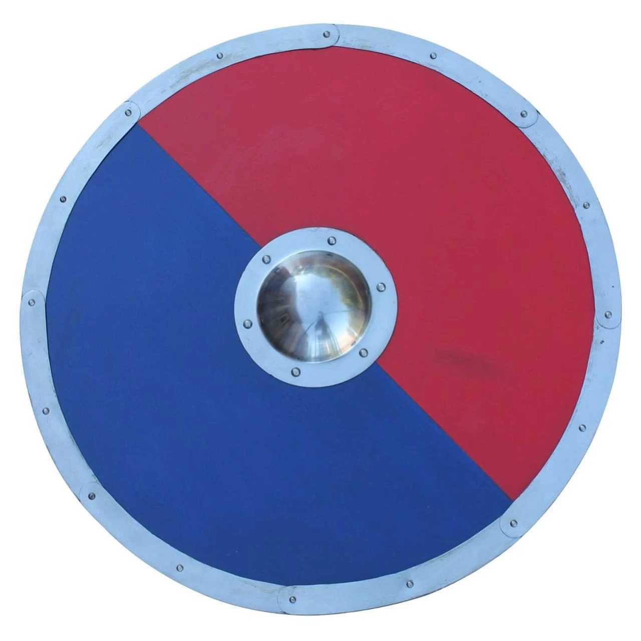 In the world of Vikings, wooden shields are a key part of each warrior’s protection and each shield is unique, painted in different colors, patterns and motifs. With a solid wood and steel construction our Anglo-Saxon Ragnvar Viking Shield is great for full contact simulated combat in reenactments, plays, or for display. This shield is painted red and blue and sealed to provide protection for the wood and a glossy finish. The boss is sixteen gauge steel, suitable for protecting your hand during practice combat. The handle is riveted to the back comfortably cupping the hand under the boss. Blue and red were popular colors throughout the Viking Age. In general, they all wore colorful clothes with patterns and sewn-on ribbons.