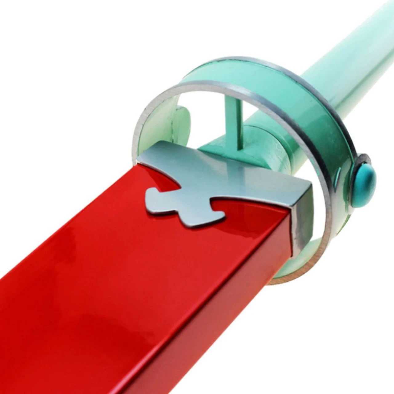 The Lambent Light is a one handed rapier owned by Asuna Yuuki of the SAO series. It was created by her best friend, Lisbeth. Asuna earned her the nickname “The Flash? due to her speed combined with her rapier. Asuna is a heroine in her own right and is the partner of Kirito. The Lambent Light is constructed of steel with a wooden handle and zinc aluminum guard and pommel. The hilt has been painted with a mint cream green color and silver detailing. This rapier has a flower on each side of the hilt that encompasses the blade for a small feminine touch. This one handed rapier includes a wooden scabbard with a glossy red finish and silver accents. Join Asuna and her trusty rapier “ Lambent Light? in the SAO adventure.