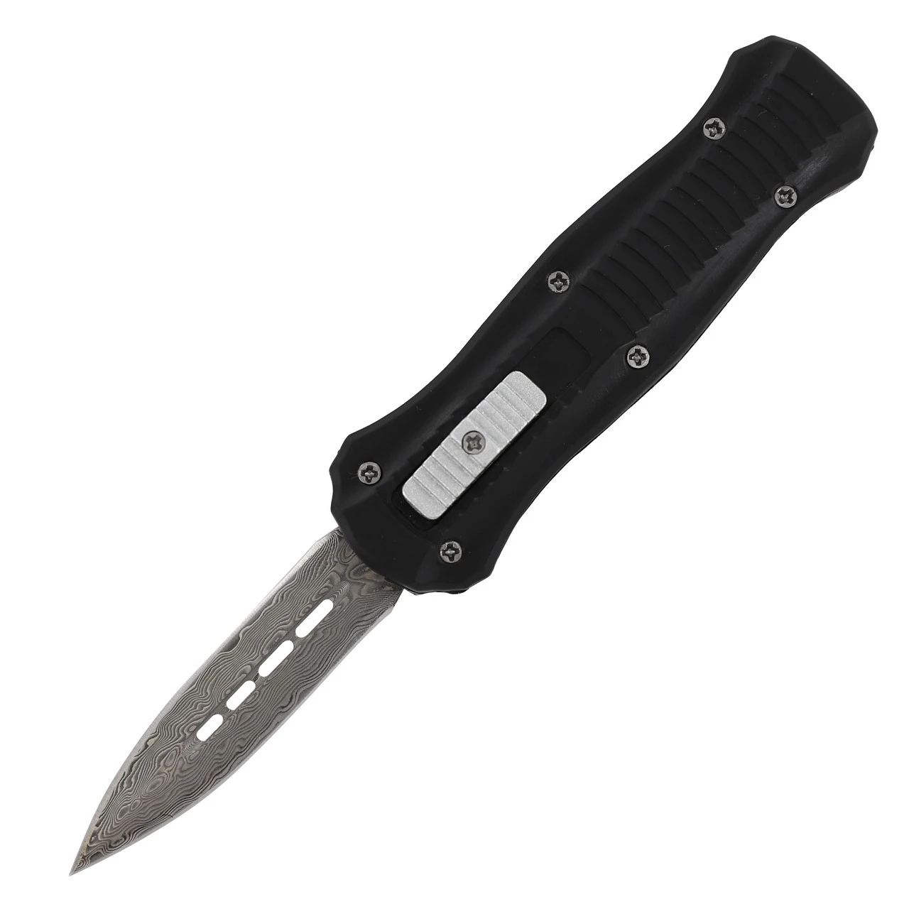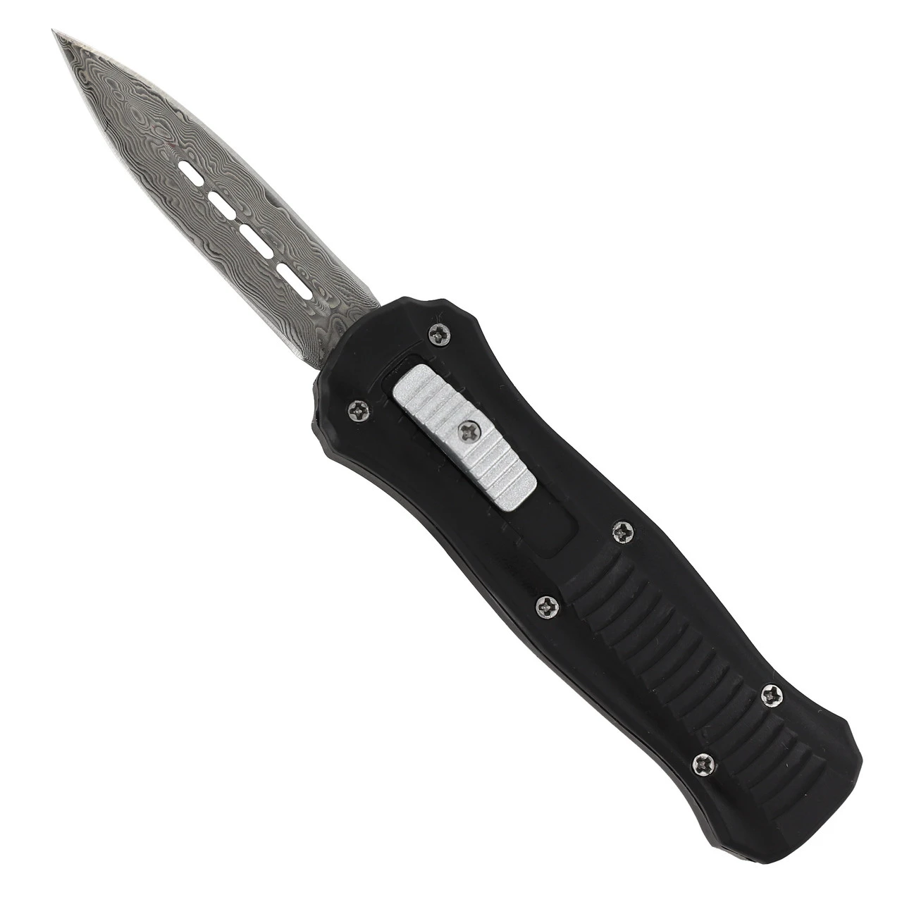 With this compact version of our best selling automatic out the front knives, you’ll have the element of surprise in the palm of your hand. Just like its larger counterpart, this knife is dual action, meaning that the blade will eject and retract with the push of a single button. Not only is it simple to operate, but it is quite durable as well. The blade is made from Damascus steel and has a gorgeous wave pattern. A matte black Cerakote finish is given to the textured zinc aluminum handle to prevent buffs and scratches. Included with your purchase is a FREE black nylon carrying case complete with a quick release opening and belt loop. Overall Length: 5.5 inches, Blade Length: 2.125 inches