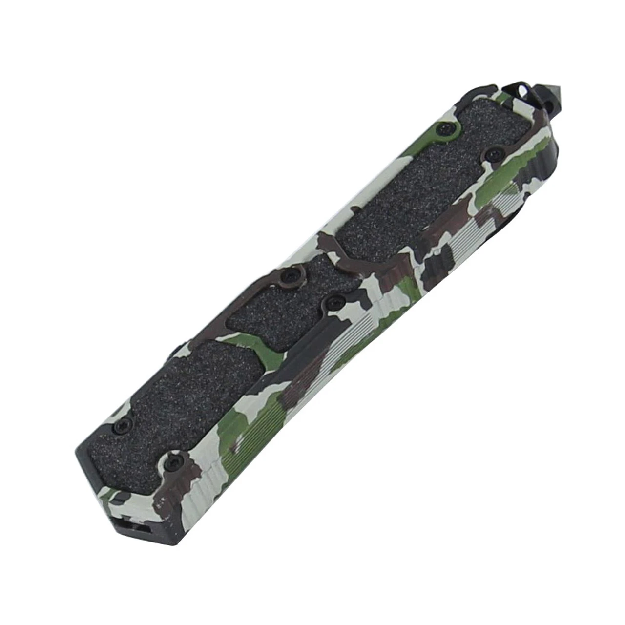 The outer casing is made from stainless steel with a camouflage design. Black sand paper inserts give a rough texture for a secure hold even when wet. The slide is featured on the side to provide flawless deployment and retraction. This slender blade pairs perfectly with the narrow handle. In a tanto style this blade comes with a saw on the spine for an array of outdoor uses. Made from stainless steel this durable knife will last for years to come. The back has a punch for emergencies with a pocket clip. As an added bonus it has a quick release nylon pouch. Overall Length: 8.5 Inches.