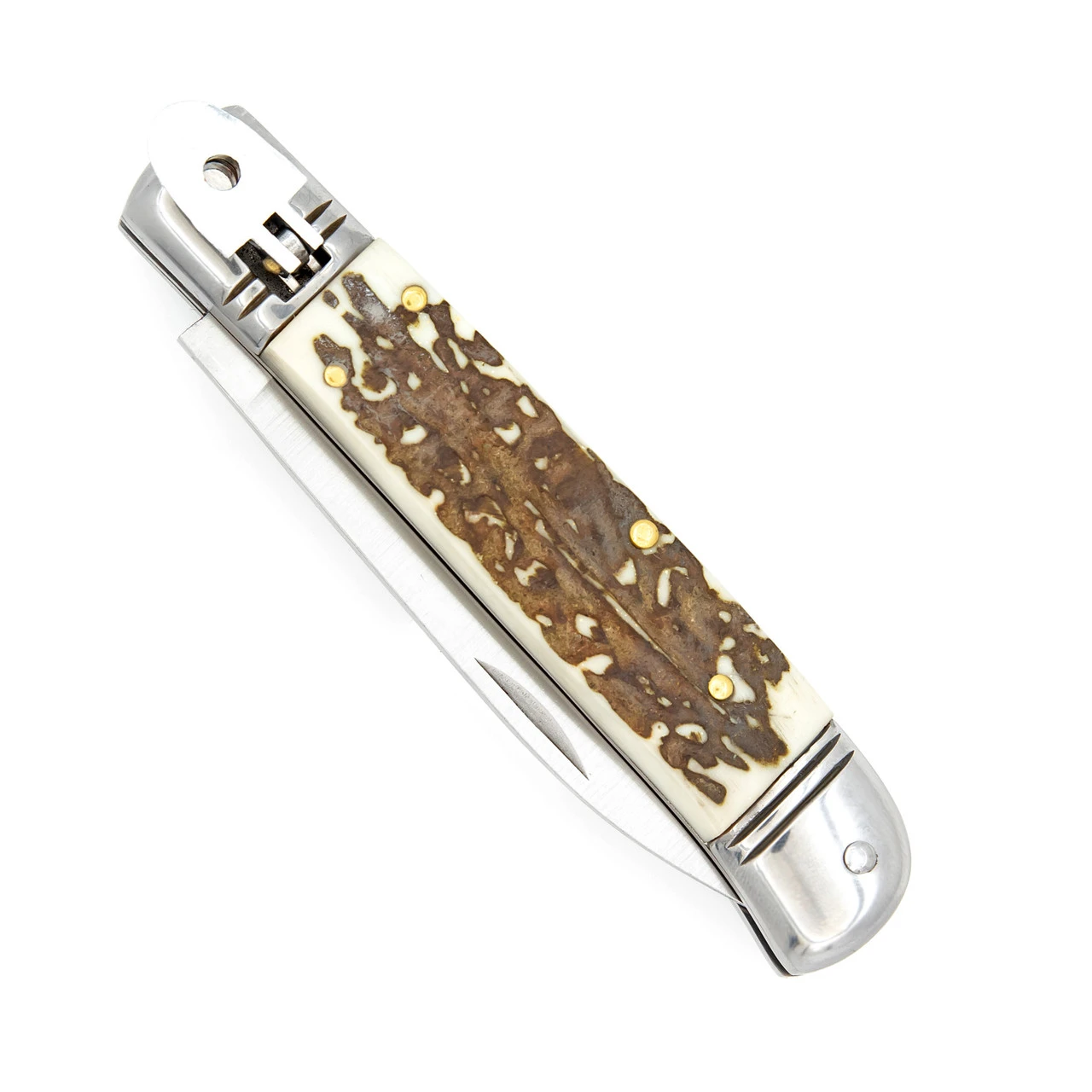 Some things don’t need to be made pretty. The beauty in rusticity is timeless and impossible to tarnish because it’s the slight imperfections that make the uniqueness beautiful. The Focus on Realism Lever Lock Knife has authentic, untreated raw staghorn grips. The blade on this knife is stainless steel and the hardware matches so the staghorn is accented beautifully resulting in a rustic and natural look. This knife is an automatic knife with a lever lock mechanism which means that there is a lever on the bolster. If this lever is pressed down then the blade will deploy, swinging out of the left side of the handle. You press the lever down again to unlock the blade so you can guide it back into the handle to close it. If you flip the lever up then the blade cannot deploy. For even safer carry and storage, the Focus on Realism Lever Lock Knife comes with its own black nylon sheath with a belt loop. Overall Length: 8 inches (Open), 4.5 inches (Closed). Weight: 0.4 lbs.