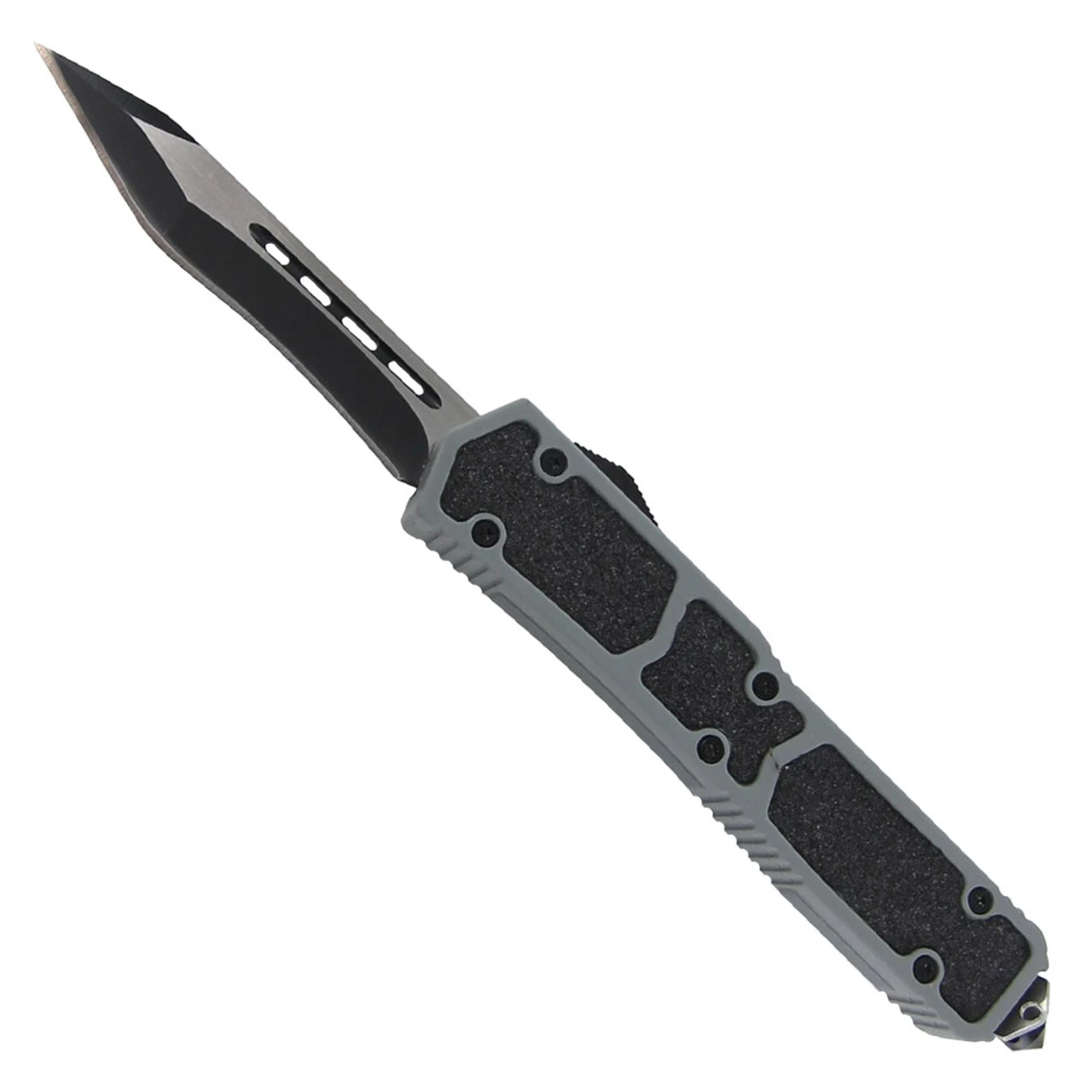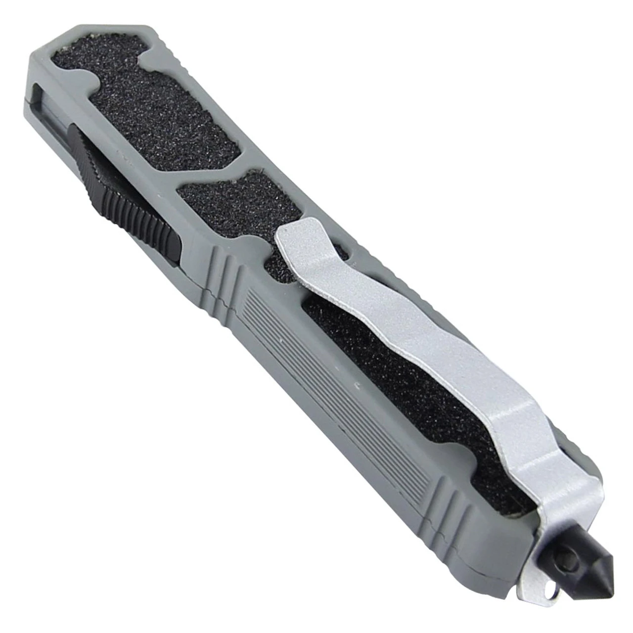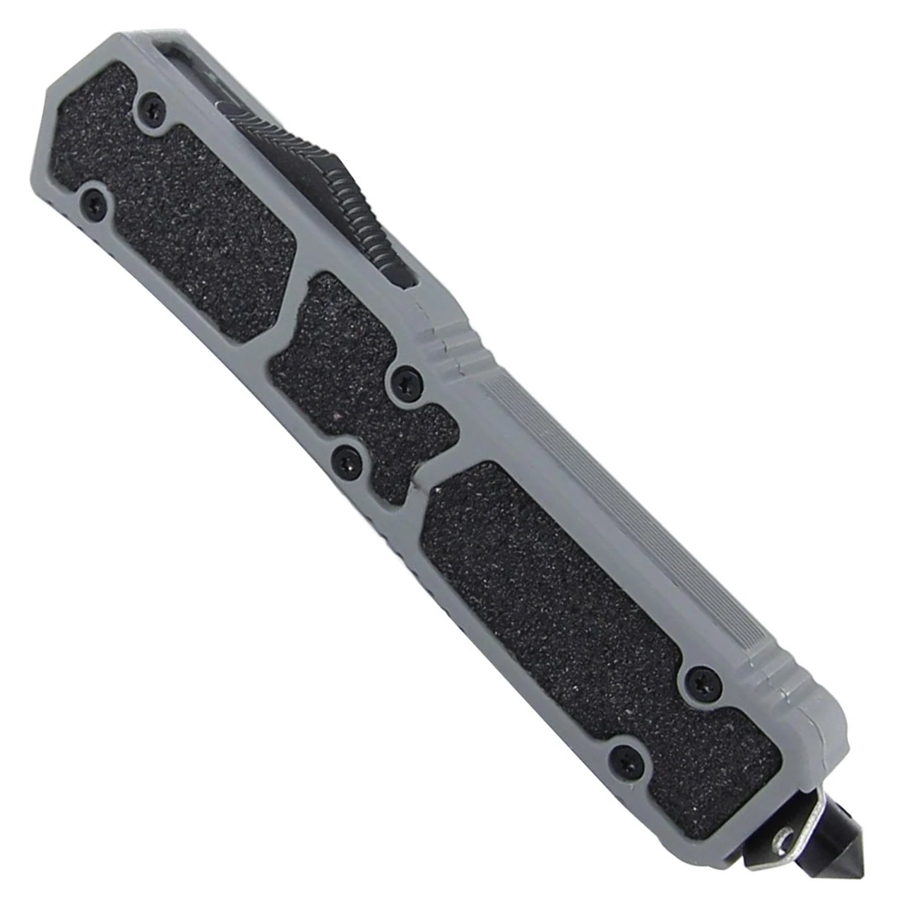 This recurved blade is made from stainless steel with a two-tone finish. The grip is zinc alloy that is contoured for a comfort. There are sand paper inserts for working in wet conditions which is an added bonus. A glass breaker is featured at the end of the handle with a steel pocket clip. Also included is a quick release nylon sheath.Overall Length: 8.50 Inches.