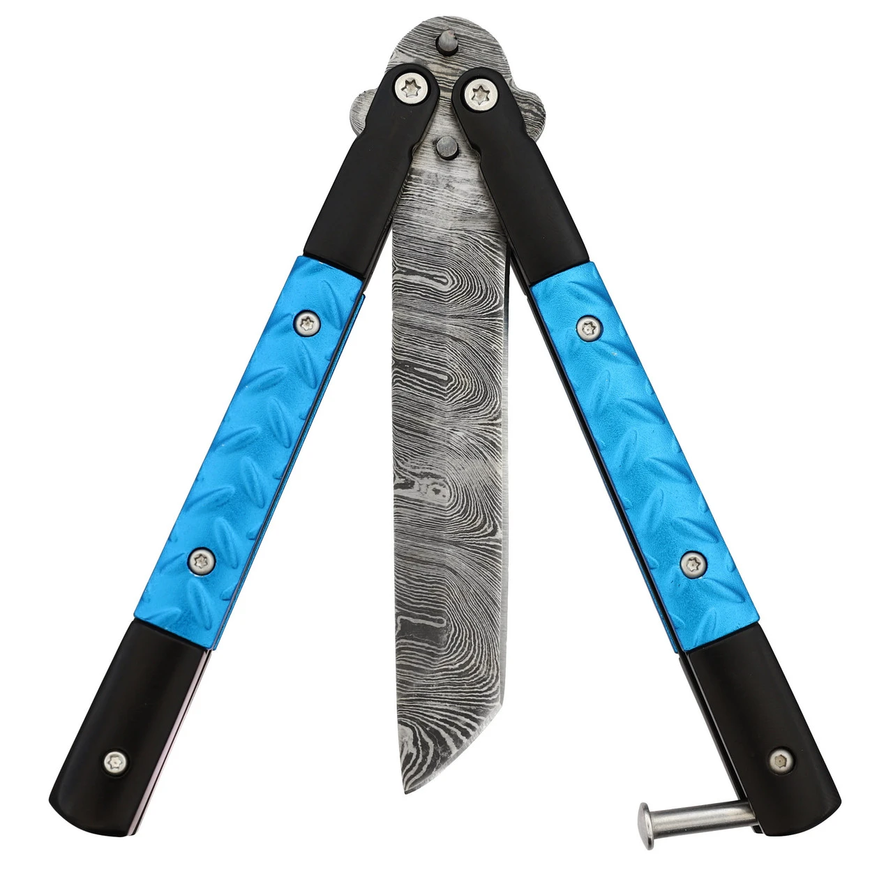 Be the first to review “Azure Sky Butterfly Knife With Hard ABS Sheath | Damascus Steel | Tanto Point Blade” Cancel reply