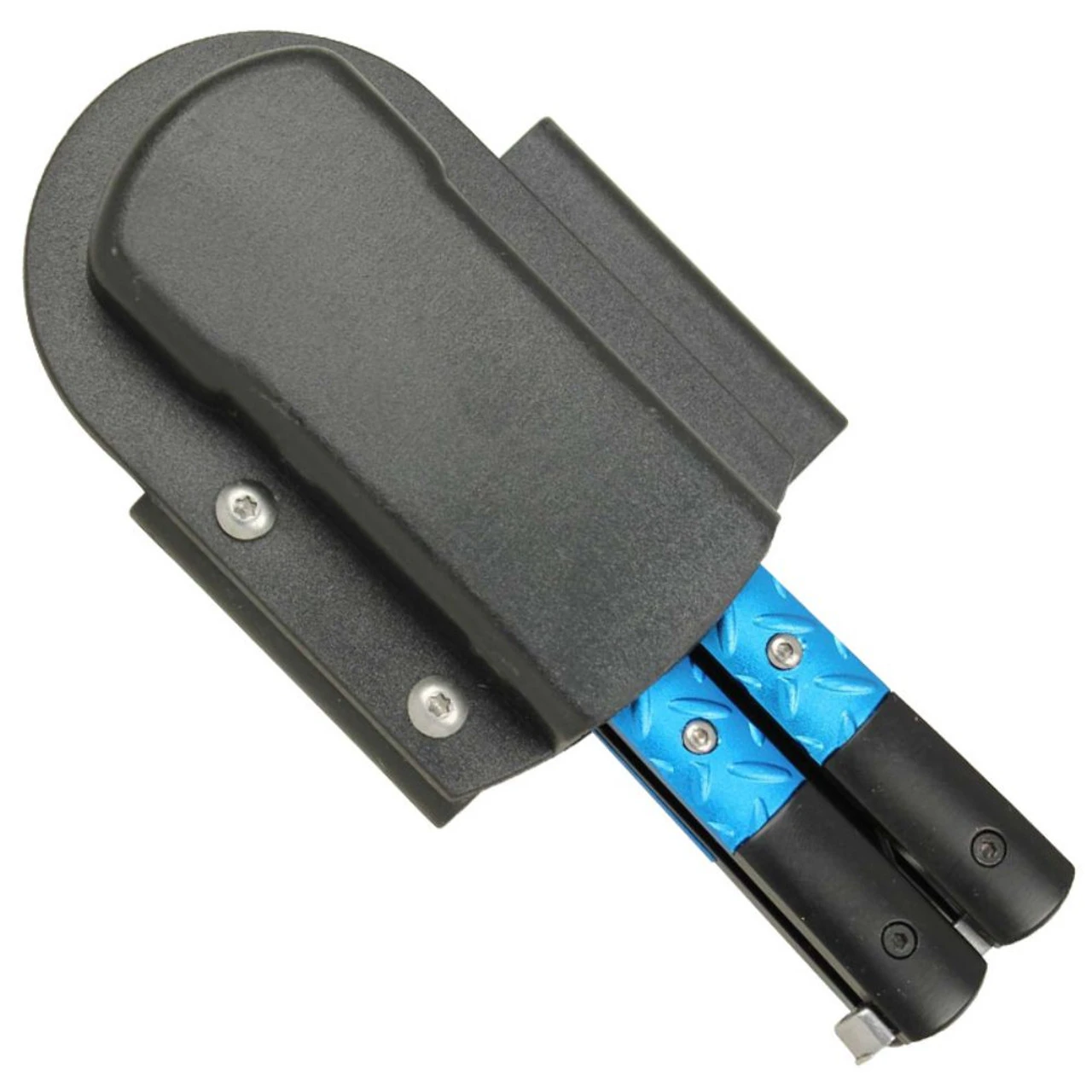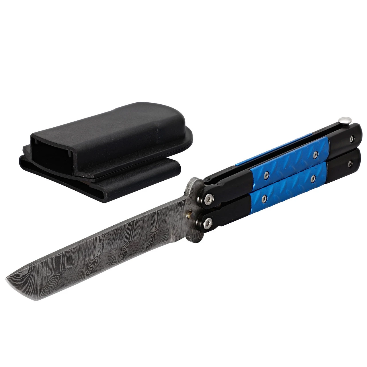 Sporting a Damascus steel tanto point blade, the slim build and good weight of this balisong butterfly knife delivers nice action in an attractive package (or you can upgrade to a damascus steel blade!). The black stainless steel handle is decorated with a Azure Blue inserts that are very attractive. A metal safety latch is included to lock the blade into place when it is not in use as well as when it is deployed. Please make sure to check your local laws regarding the procession and import of these knives. Overall Length: 9 Inches Blade Length: 4 Inches Blade Material: Stainless Steel, Black finish Blade Style: Clip Point Blade Thickness: 2.50 mm Handle: 4.75 Inches, Steel with cast metal inserts Includes: Safety Latch, Heavy Duty Construction, 1 Inch Fuller, ABS Holster.