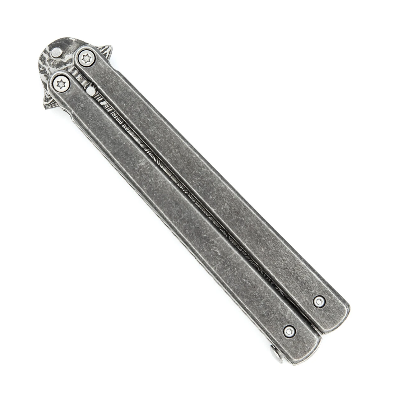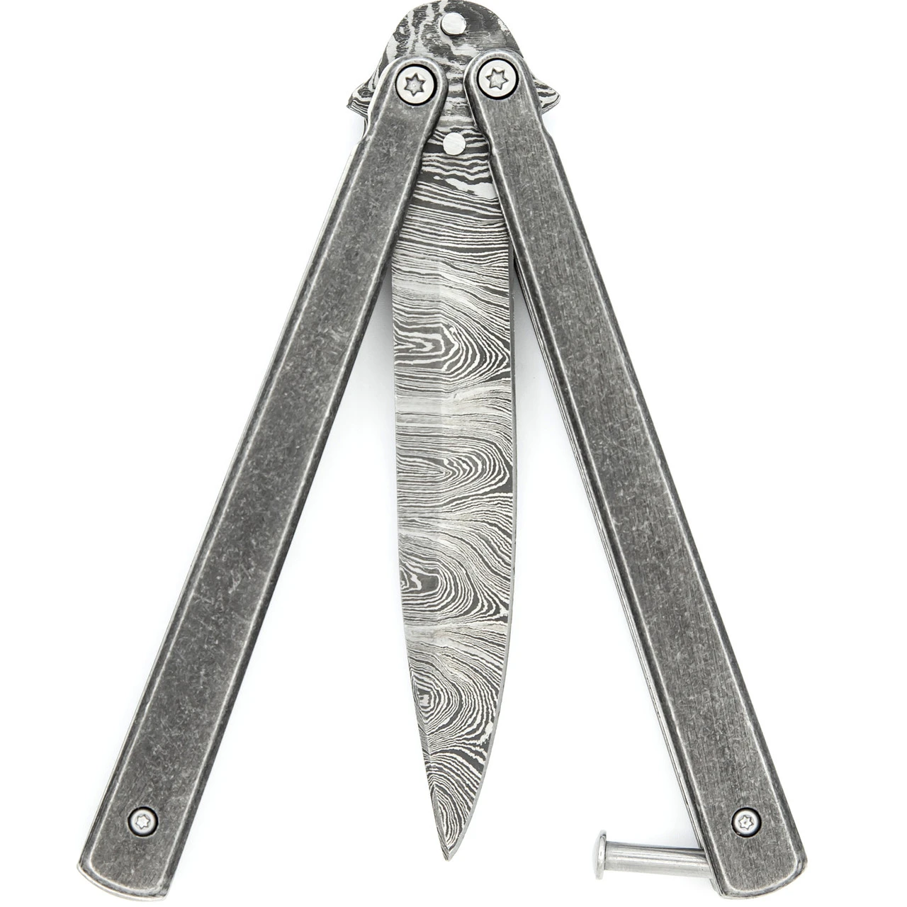 This Damascus steel blade comes in a drop point style with the entire body covered in a gorgeous wave-like pattern. The handle is double walled with a steel frame. Each piece is riveted together even the pivot pins are rivets. With a sturdy construction such as this, how can you beat this deal? The drop point style blade has become popular for its extra cutting edge. This knife comes double pinned. The reason for this is to hold the blade away from the handle when closed to prevent dulling; and, in some cases, a second pin to keep the handles from excessively banging together while the butterfly knife is being manipulated. A safety latch is provided for locking your blade opened or closed. Overall Length: 8.75 Inches.