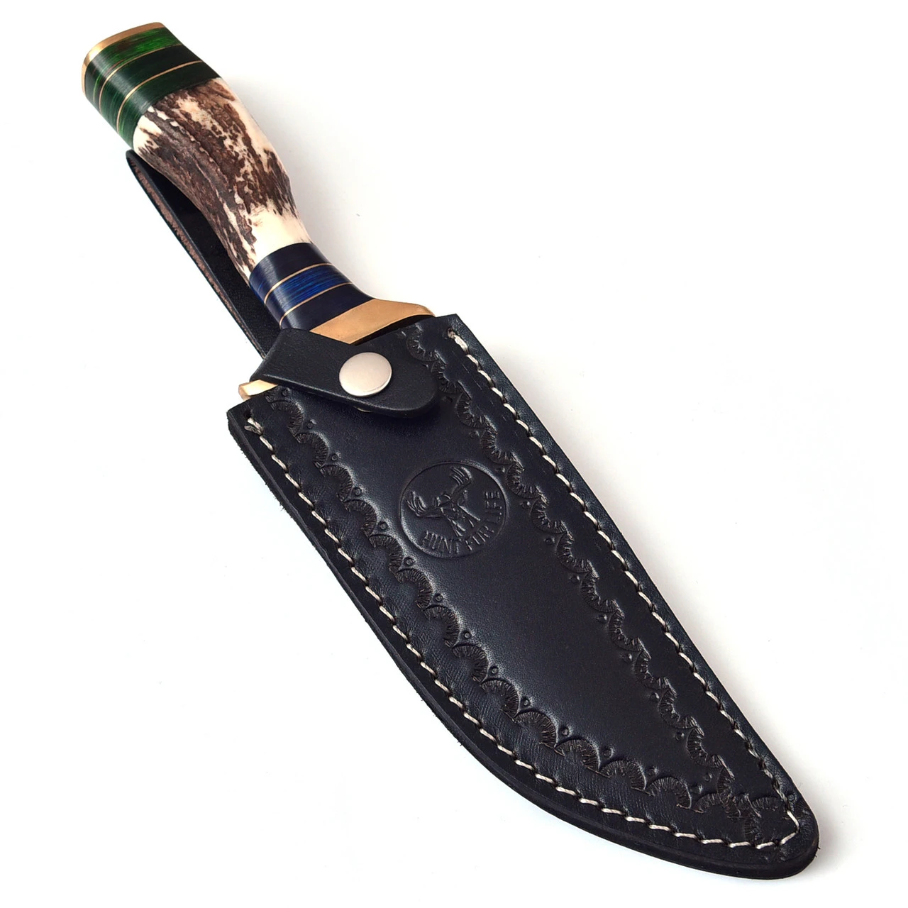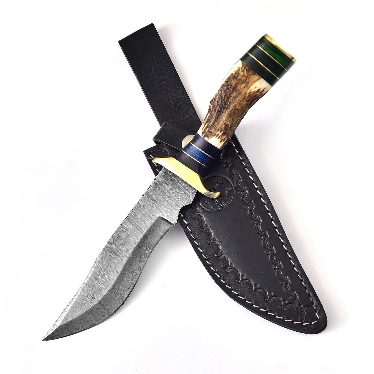 Winds pours through the trees causing the leaves to shake and the sound of animal calls to dim for a moment. It returns louder and with closed eyes the sound of streams, leaves, footsteps, chirping, antlers colliding, and branches breaking seem to envelope the space in an orchestral display of vibrancy and life. Every hunter knows the feeling just as every hunter knows that packing a bad knife can ruin this in a second. The Cacophonous Forest Fixed Blade Clip Point Damascus Outdoor Hunting Knife is right at home among the trees and ready for action at a moments notice. The slender staghorn handle provides a perfect grip and the micarta composite gives a gorgeous green ombre effect at the pommel and a million shades of luscious blue at the guard. However, this knife isn’t only for show. The 6.65-inch Damascus steel blade is strong enough to withstand the toughest of outdoor activities in style. The solid brass guard is tapered at the quillon for an extra secure grip and the leather sheath that comes with the Cacophonous Forest makes it easy to carry when not in use. The Cacophonous Forest Fixed Blade Clip Point Damascus Outdoor Hunting Knife is sure to bring some harmony to your next hunting trip.