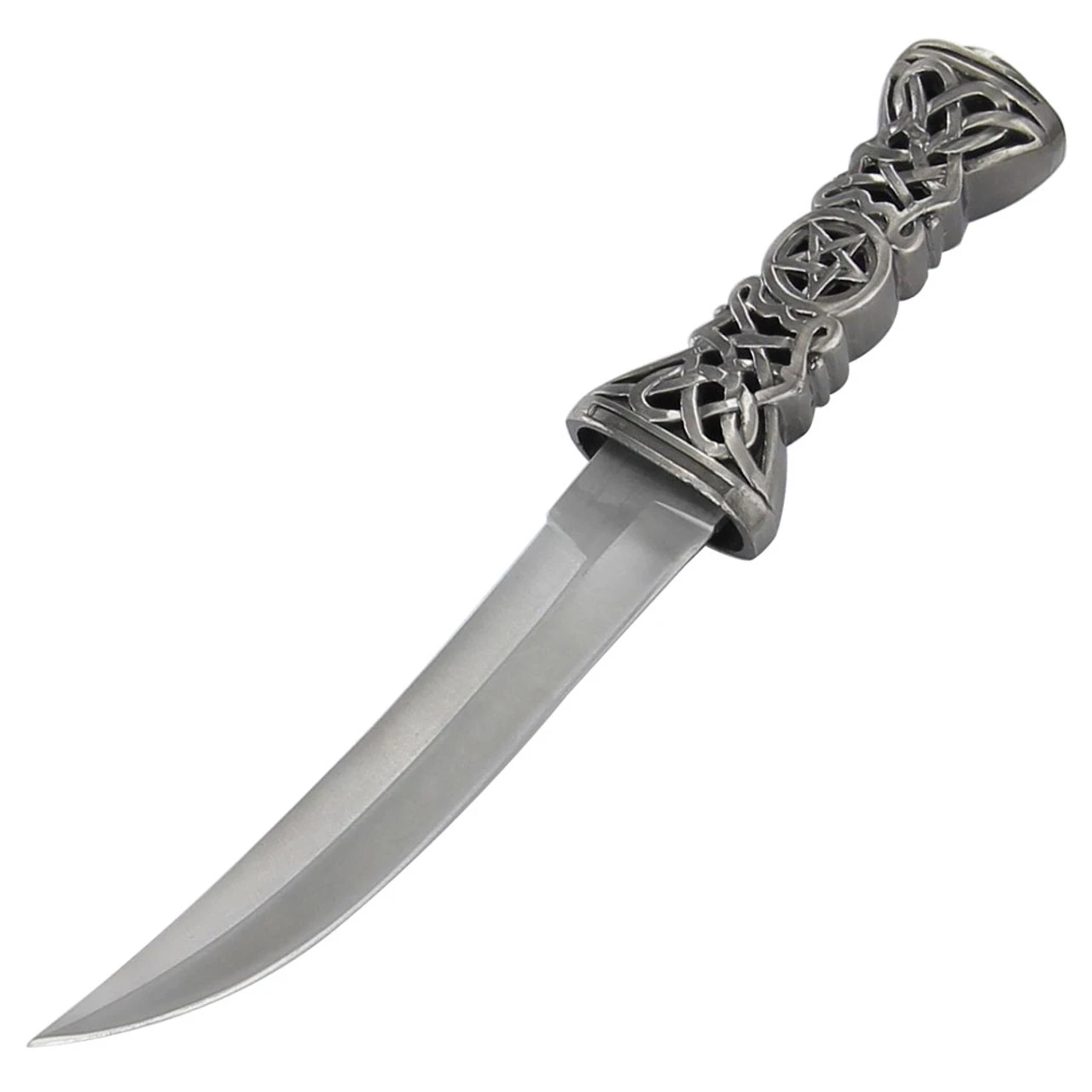 This knife comes with a stainless steel blade and a satin finish. The handle is made from zinc aluminum that has been molded into Celtic knots. In the center of the design you will see a pentacle. The metal work has a brushed finish for a unique design element. The pommel has a faux emerald. The sheath is black and made from ABS with a red knot design on both sides with a metal end tip that also features a pentacle.Overall Length: 12 Inches in Sheath