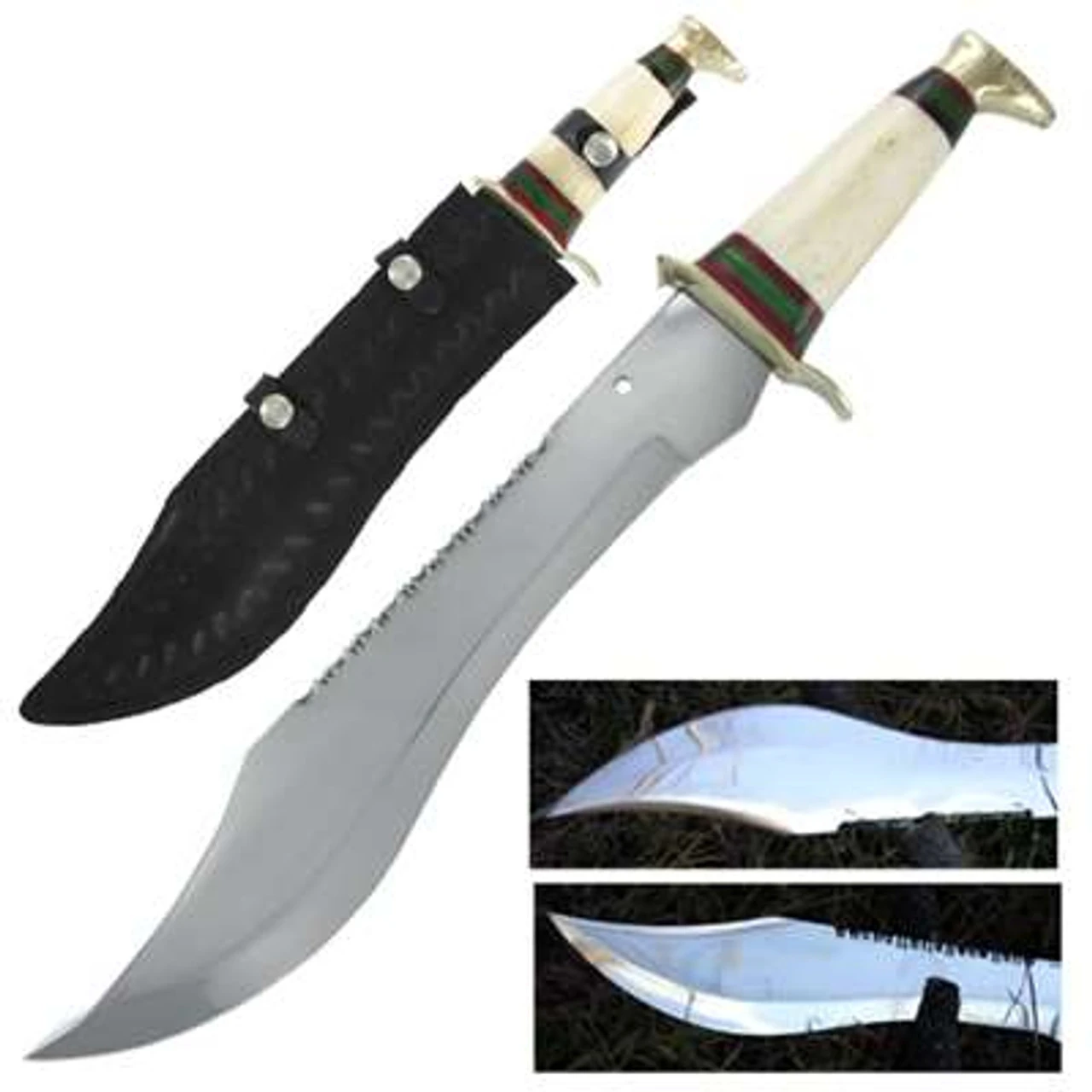 Made from a mirror polish stainless steel and stag horn with brass fittings, this knife will be a lasting knife. It features a brass pommel followed by a Stag Horn handle. The handle has a color and ivory finish. The Crocodile Hunters knife has a small brass tanguard to help protect your hands from slipping to the blade. The clip point blade is mirror polish 440 stainless steel with a sharp belly edge, small upper false edge and a dual purpose serrated and saw spine. It also has a lanyard hole. This knife will give anyone who crosses its path a good case of “Crocodile Fever.” It comes complete with a black design stamped sheath with belt loop. Overall Length: 17.25 inch