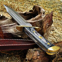 The reputation of Damascus steel for flair stretches back centuries. The mystery and intrigue about these blades have led to several legends. One legend says that these blades were quenched in dragons blood but never mind that. We do know that these blades come in an array of stunning patterns and are usually partnered with quality materials. They also are able to retain an edge longer. This blade is made of course from Damascus steel as you can see from the easily recognizable watery or ”damask” pattern. The style of pattern used here is Random and featured at the top of this blade is a thumb notch and stud. Exquisite custom file work runs along the spine down into the handle. The frame and liner lock are produced from brass with artistic file work too. The handle is polished bone that has been stained a vibrant blue with copper bolsters. Each bolster has a silver finish with a lovely floral design. But this Artisan didnt stop there, oh no. He went ahead and added a handmade decorative sheath as well to compliment this beautiful Knife. It comes with a snap closure and belt loop on the back.