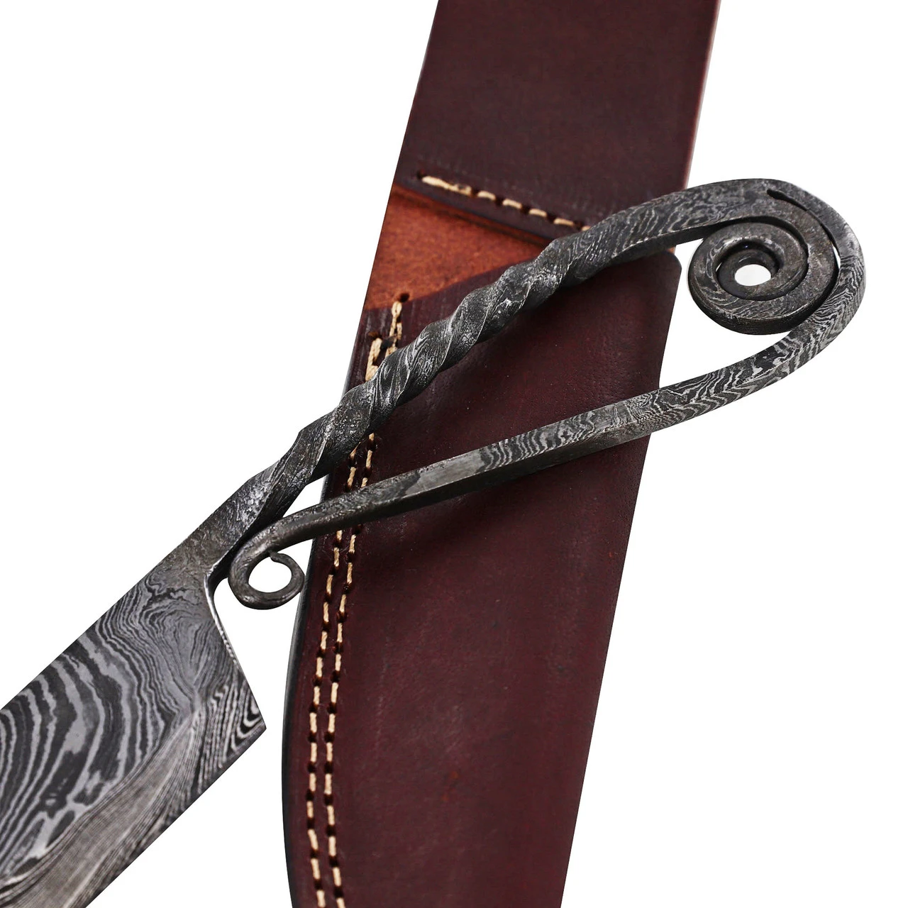 The silverware used when serving your guests can really make or break an event. What better way to compliment your meal than with an elegant banquet knife? This gorgeous piece is made entirely of 1095/15N20 Damascus steel. From tip to end you can see the graceful wave-like pattern that these blended steels produce. The blade is forged into a drop point style and features a standard sharpening. The handle has been masterfully twisted and the end bent back inward towards the blade to produce 2 dainty swirls. Though it is a functional piece, this delicate design is better to slice into softer materials such as cheese on your holiday charcuterie board or to cut your wedding cake in style! Included with this beauty is a hand tooled sheath made from genuine bovine leather.