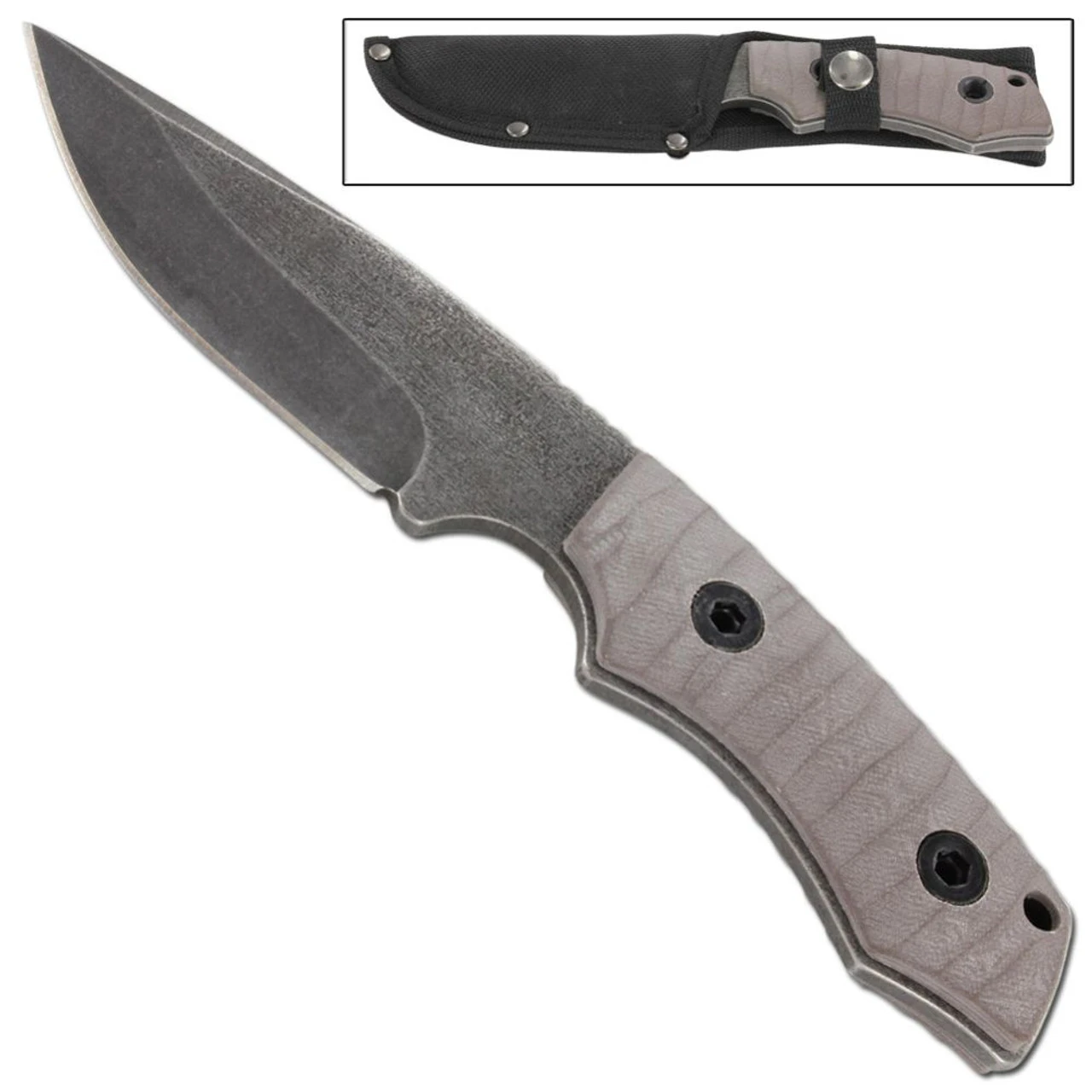 The Dark Retaliation Outdoor Hunting Knife a full tang drop point style blade with stonewash finish. The blade is constructed from 440 stainless steel with a G-10 handle. Included is a nylon sheath with steel snaps and rivets. Overall length is 8.75 inches.