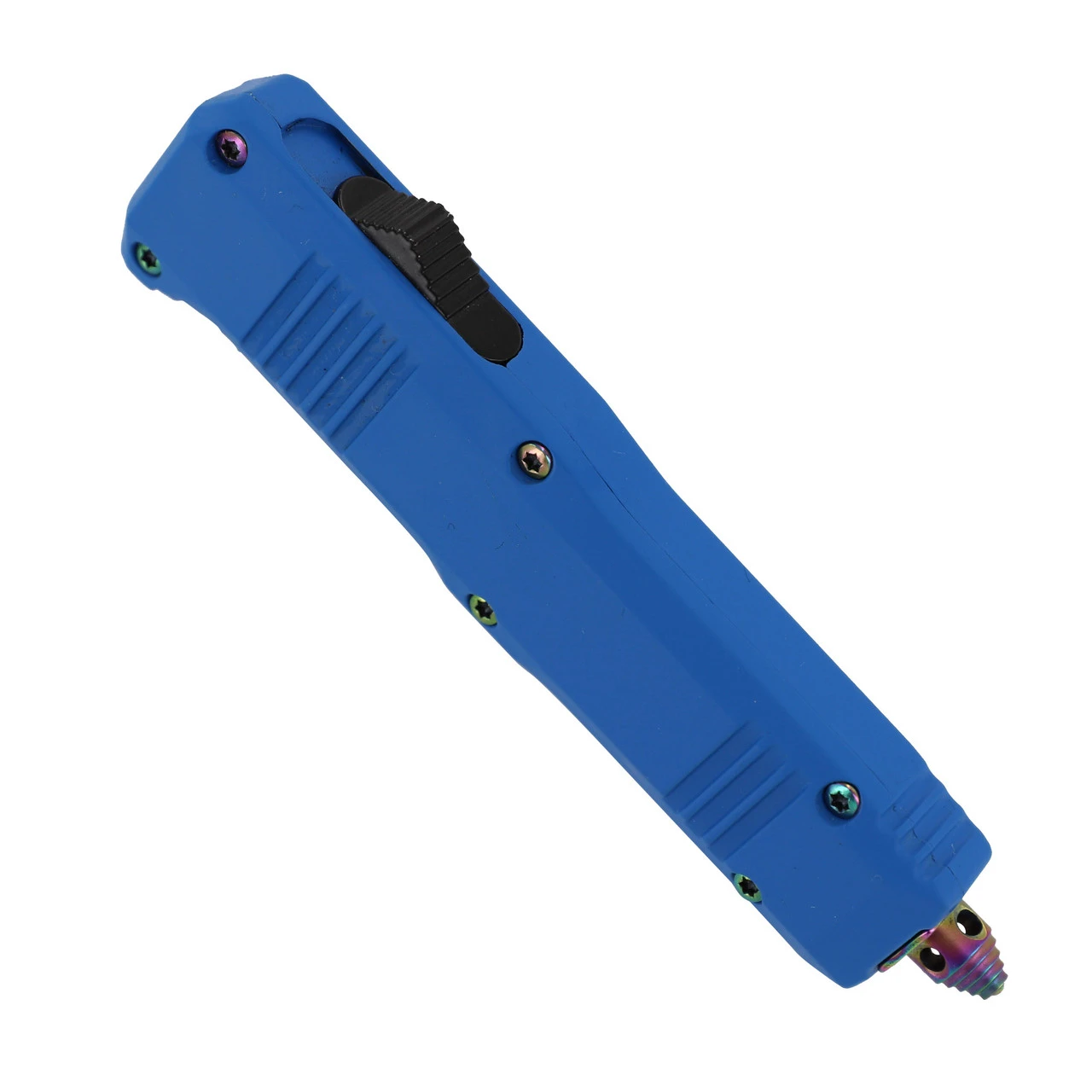 This little guy is conveniently small enough to carry everywhere you go, while still packing the same punch you’d expect with normal-sized out the front knives. The blade is made from Damascus steel and features a gorgeous titanium rainbow finish. The dagger point style of the blade has two sharp edges that let the knife puncture and cut in on both sides. Push up the switch on the side of the handle to deploy the blade in the blink of an eye. Push the switch down to retract the blade. The sleek blue zinc alloy handle features titanium toned hardware, including a glass breaker and pocket clip. As if you needed any more convincing, this knife comes complete with a FREE black nylon sheath that has a quick release opening and belt loop for easy carry.