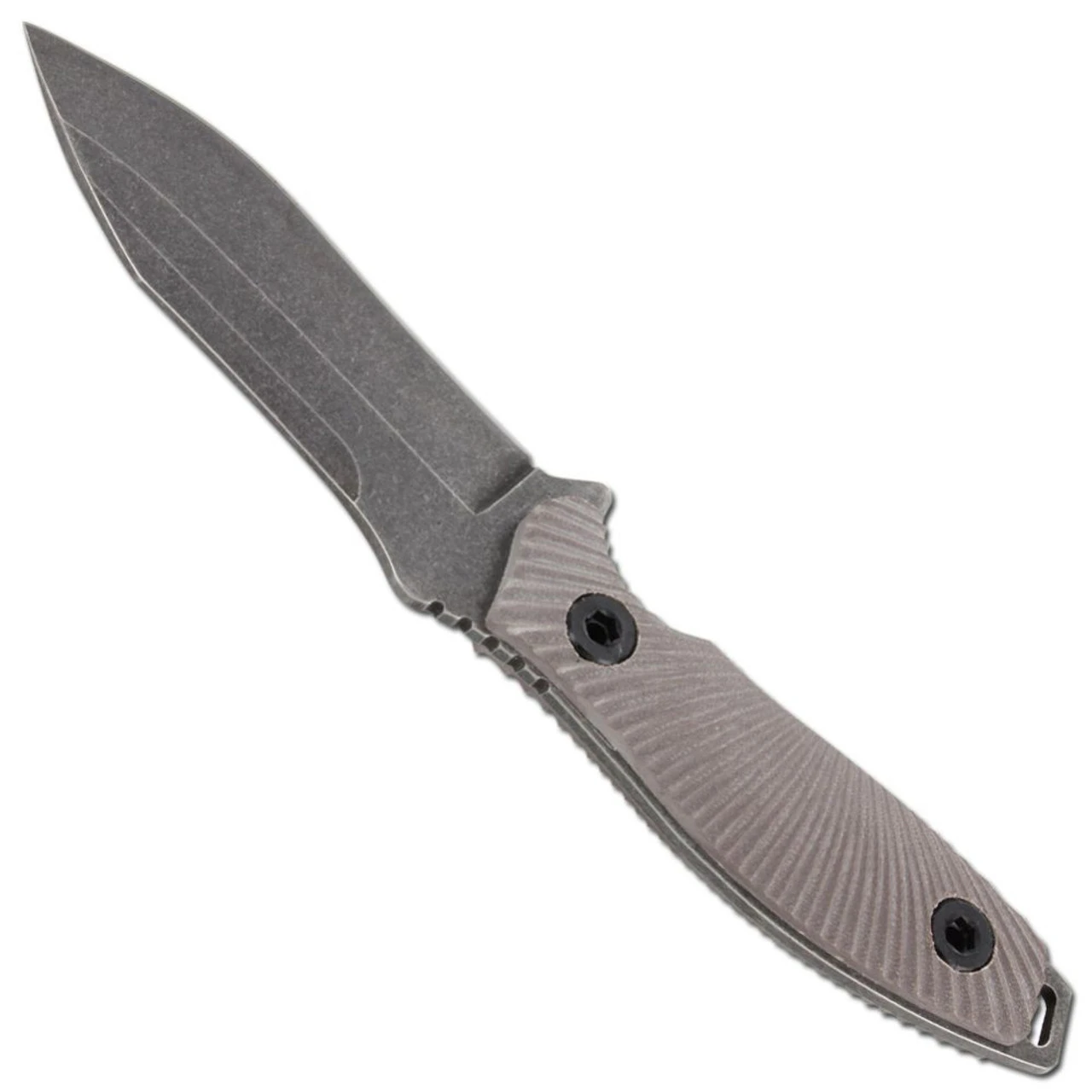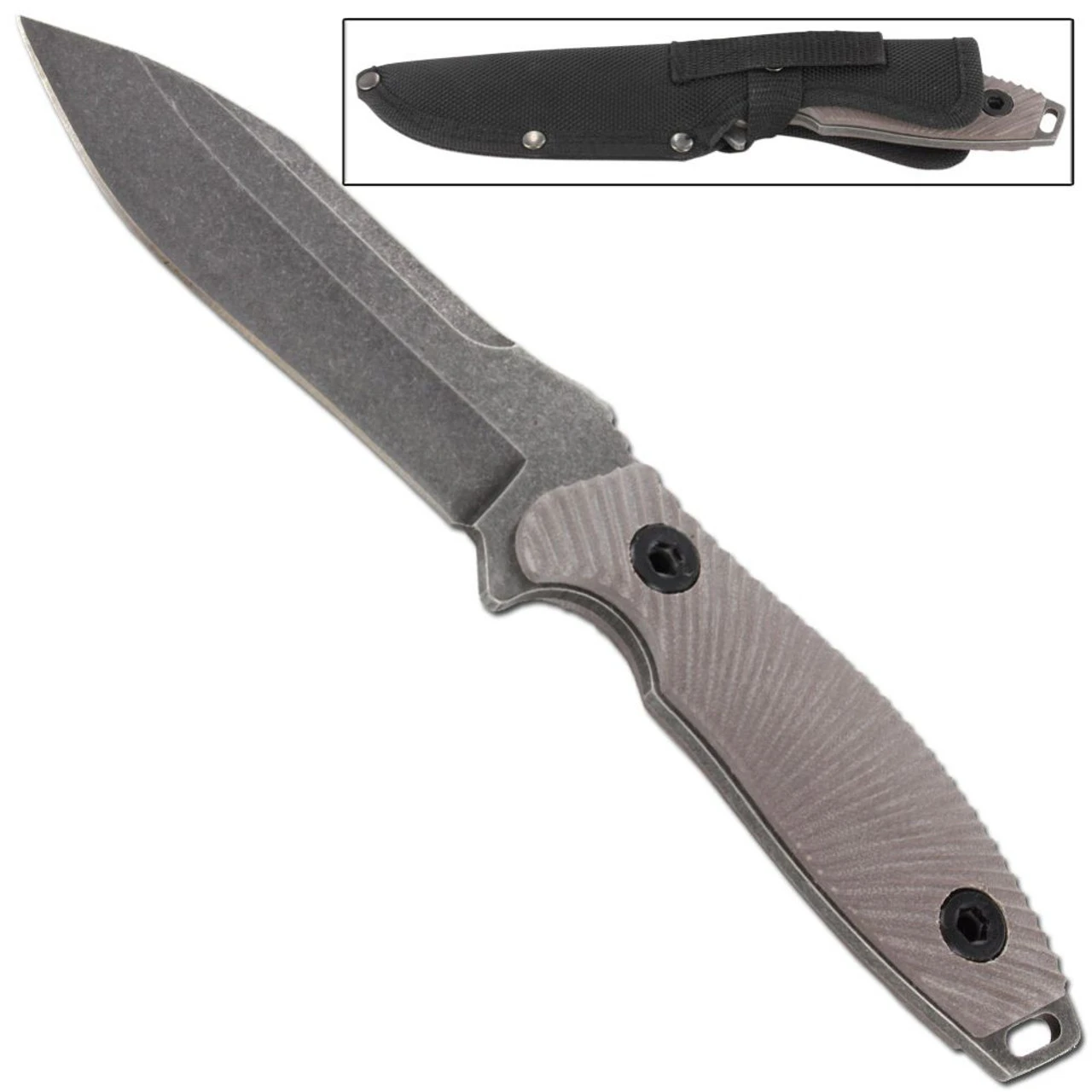 The Deadly Oppressor Dao Blade Outdoor Knife a full tang dao style blade with stonewash finish. The blade is constructed from 440 stainless steel with a G-10 handle. Included is a nylon sheath with steel snaps and rivets. Overall length is 10 inches.