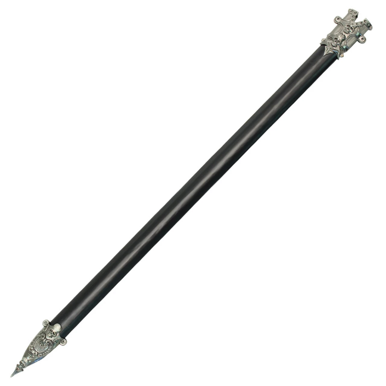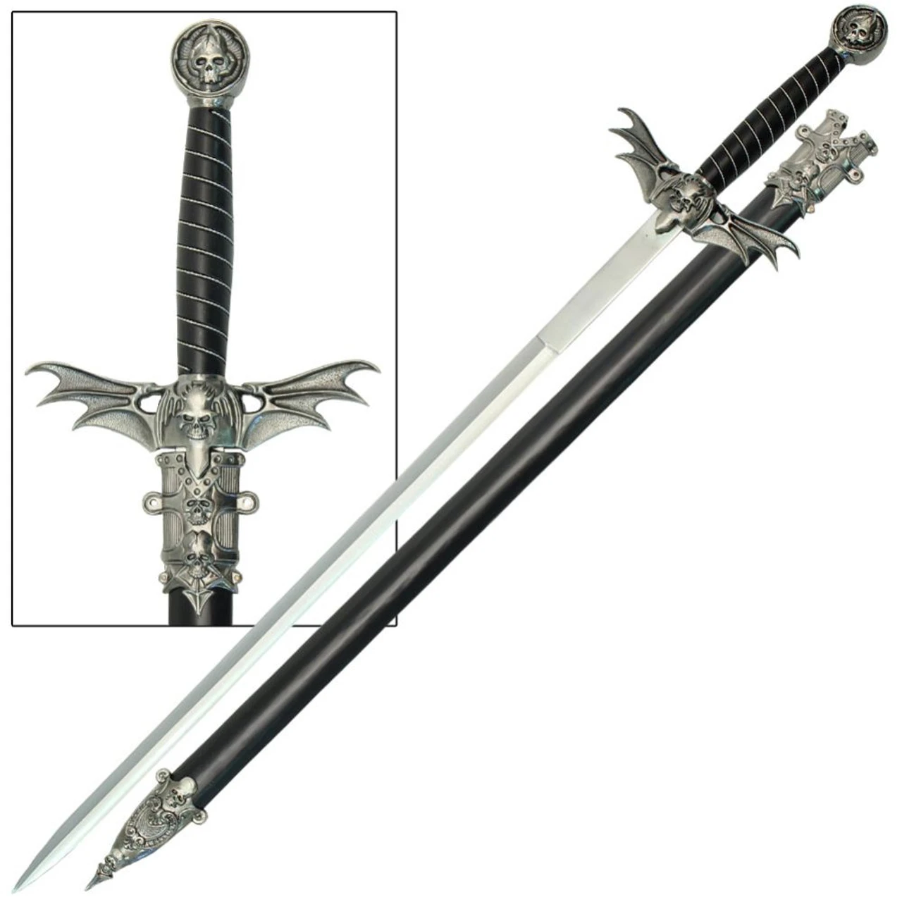 This medieval fantasy sword blade is constructed of 440 stainless steel and is 24.25 inches long. The handle is an ABS material with an ABS scabbard with steel accents. Overall length is 33.5 Inches.