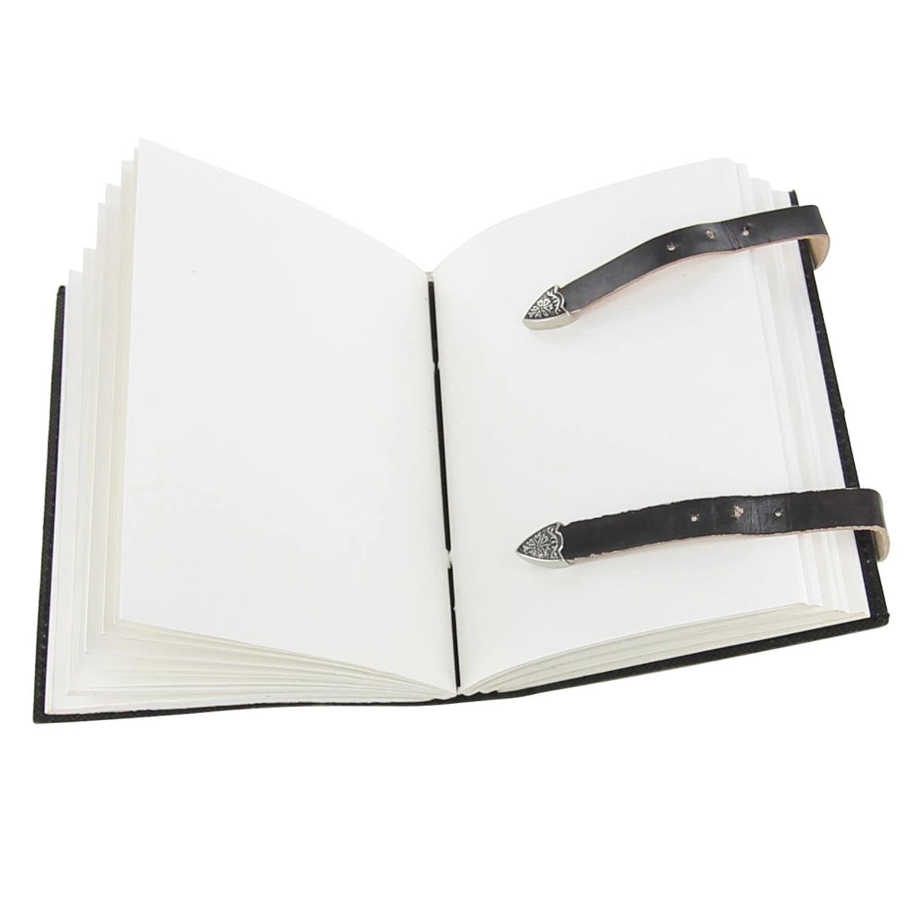 A diary is a personal thing to us all. It is a place to record allover our thoughts and feelings. Keeping a diary benefits us for all sorts of reasons. It helps us to arrange our thoughts, reflect on our actions so we can grow, gives us a creative output. This leather diary offers 220 pages (counted both sides) soft 100 g/m2 decledged off white pages. The designs are various Celtic knots on the front and back. The outside is genuine black leather with embossed borders on the front, sides, and back. The pages are held together with black sting which offers a unique design X design on the outside. When you are finish, simply close the flap and lock your thoughts up tightly inside with the lovely floral double belt buckles.