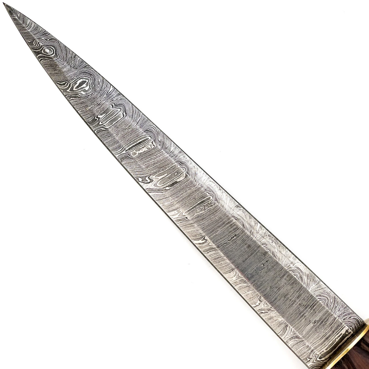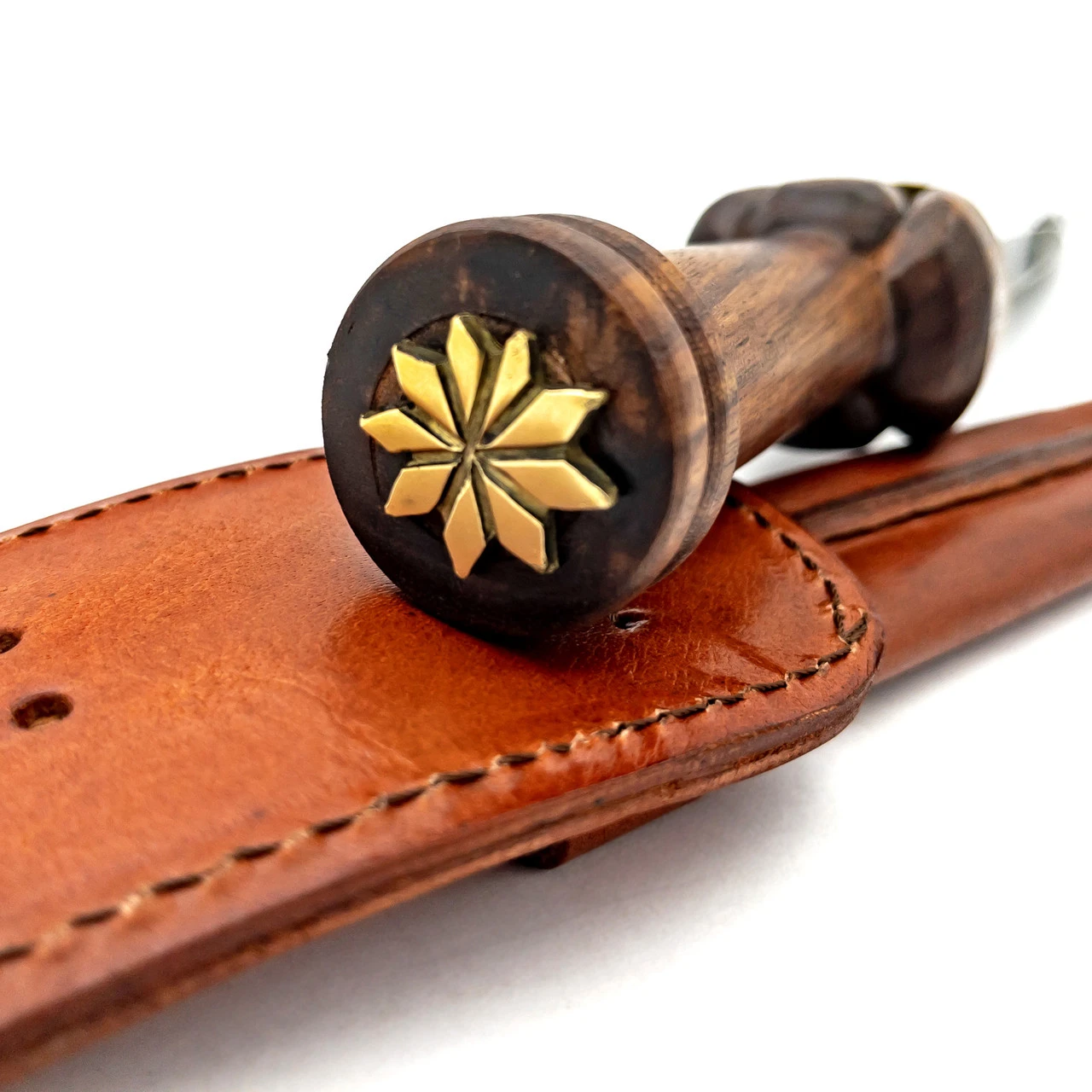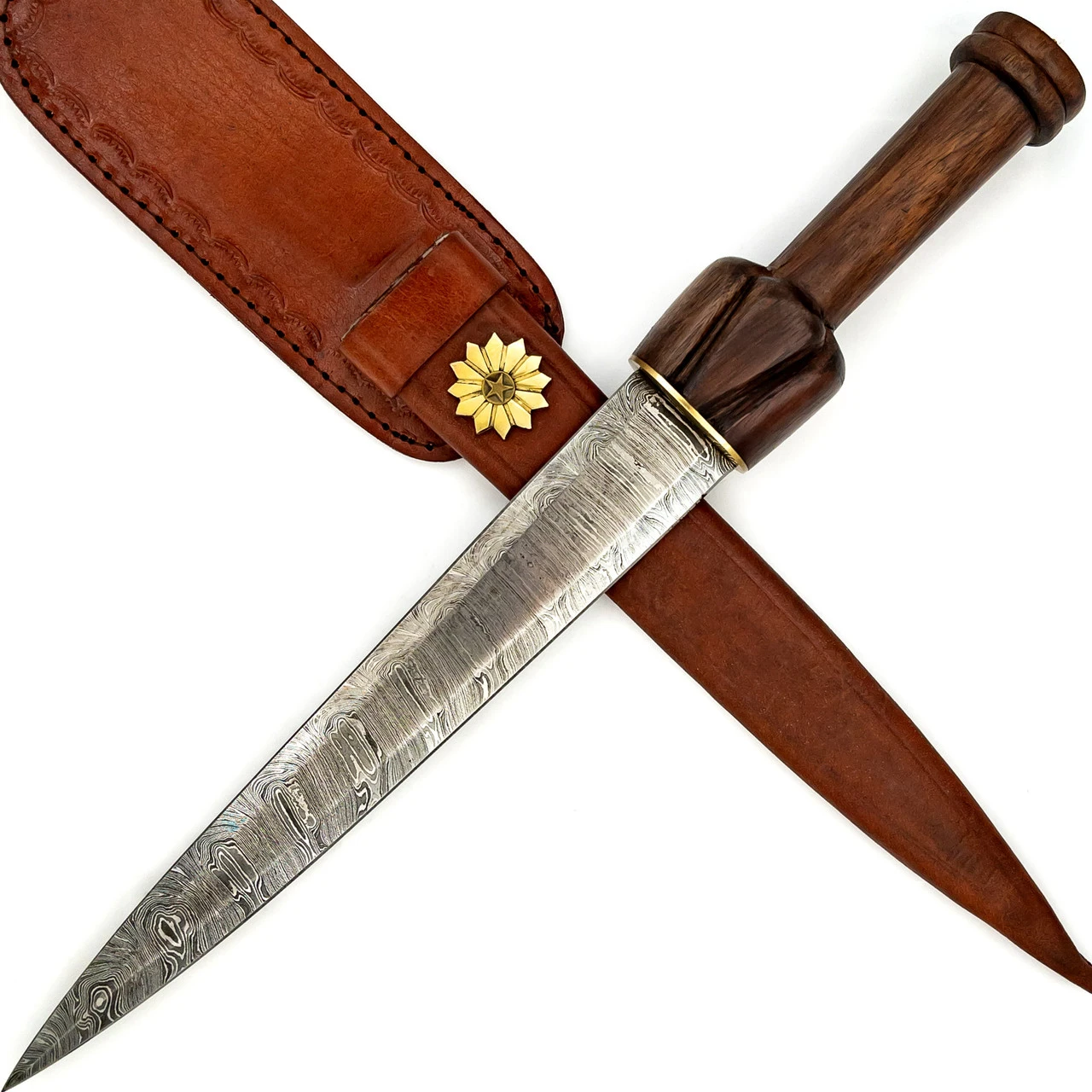 This elegant dagger features a 10-inch-long double-edged blade masterfully forged by hand from 1095 and 15N20 steels. These steels have been heated and folded into each other over and over, creating approximately 280-350 layers of Damascus steel. Not only does the method used make a gorgeous ladder pattern, it also produces a shatter-resistant blade that holds a sharp edge much better and longer than most steels. The pattern observed is one of kind, and no two knife is exactly alike for this reason. Encapsulating the tang of the blade is a hand carved sheesham wood handle that is stained a rich brown. The handle has a circular shape that is easy to hold, with a rounded protrusion that forms the hand guard. The guard is divided from the blade by a pure brass chappe. A 12-pointed star also made from pure brass tops the pommel. This star is also featured on the hand tooled leather sheath. A classy dagger deserves an even more elegant sheath to house it when not in use, and this russet brown leather sheath complete with paddle back and belt loop is the perfect pairing for this ornate dagger. Overall Length: 15.5 Inches, Blade Length: 10 Inches