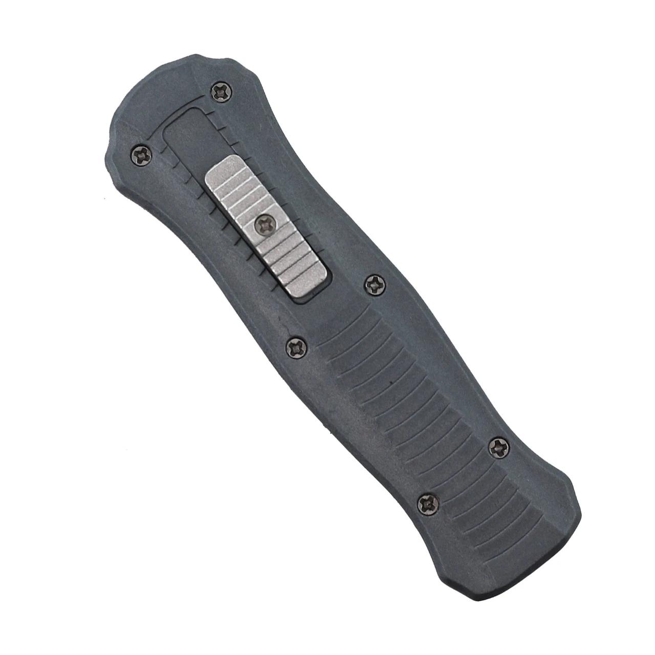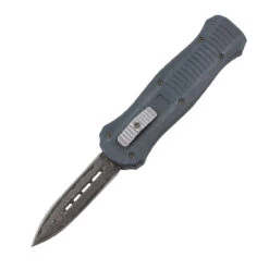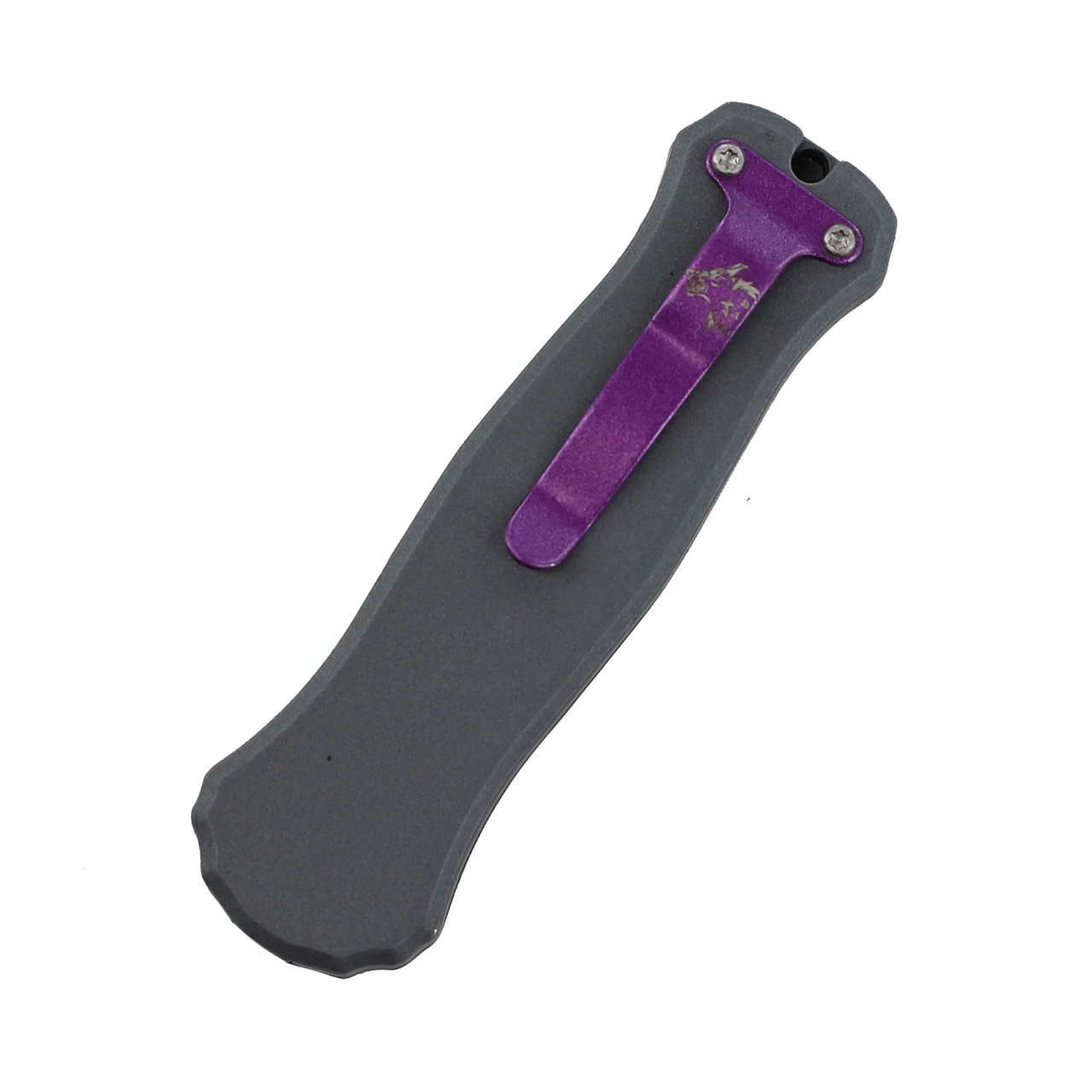 With this compact version of our bestselling automatic out the front knives, you’ll have the element of surprise in the palm of your hand. Just like its larger counterpart, this knife is dual action, meaning that the blade will eject and retract with the push of a single button. Not only is it simple to operate, but it is quite durable as well. The blade is made from Damascus steel and has a gorgeous wave pattern. A gunmetal Cerakote finish is given to the textured zinc aluminum handle to prevent buffs and scratches. A silver firing button and sleek purple pocket clip are located on the handle. Included with your purchase is a FREE black nylon carrying case complete with a quick release opening and belt loop. Overall Length: 5.5 inches, Blade Length: 2.125 inches