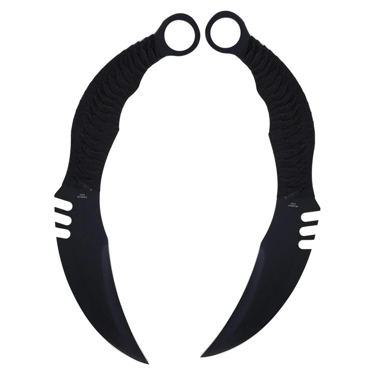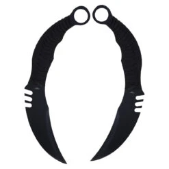 The first glance is striking, but the second, real look knocks you off your feet. Dark as night, sharp, with the slightest of serration, only what you need. The weight in your hands is real. The contoured handle shaped perfectly to the curve of your fingers. A full 7-inch blade jutting from your closed fist. Karambits take a minute to get used to but they are one of the most unique knives in the world. Actually, there is one thing better than a Karambit: two karambits. Both with the iconic finger hole in the pommel for spin moves.