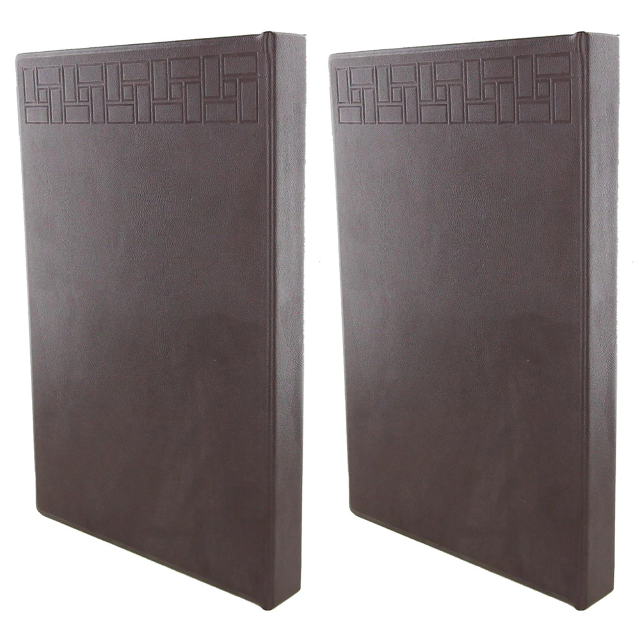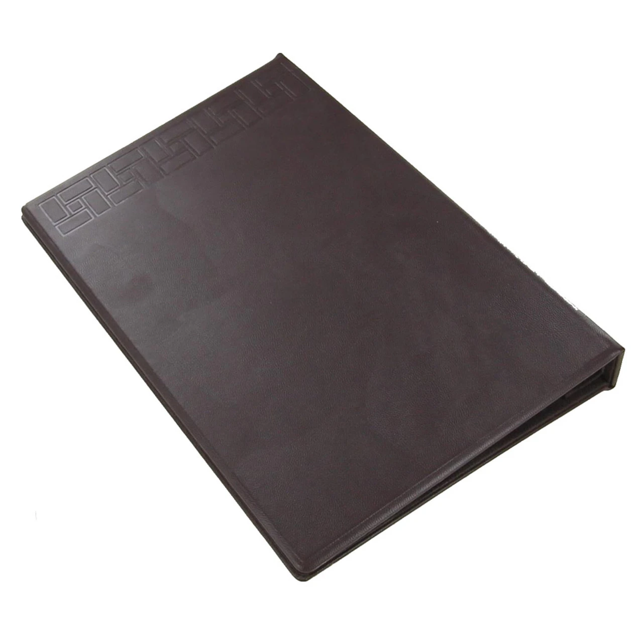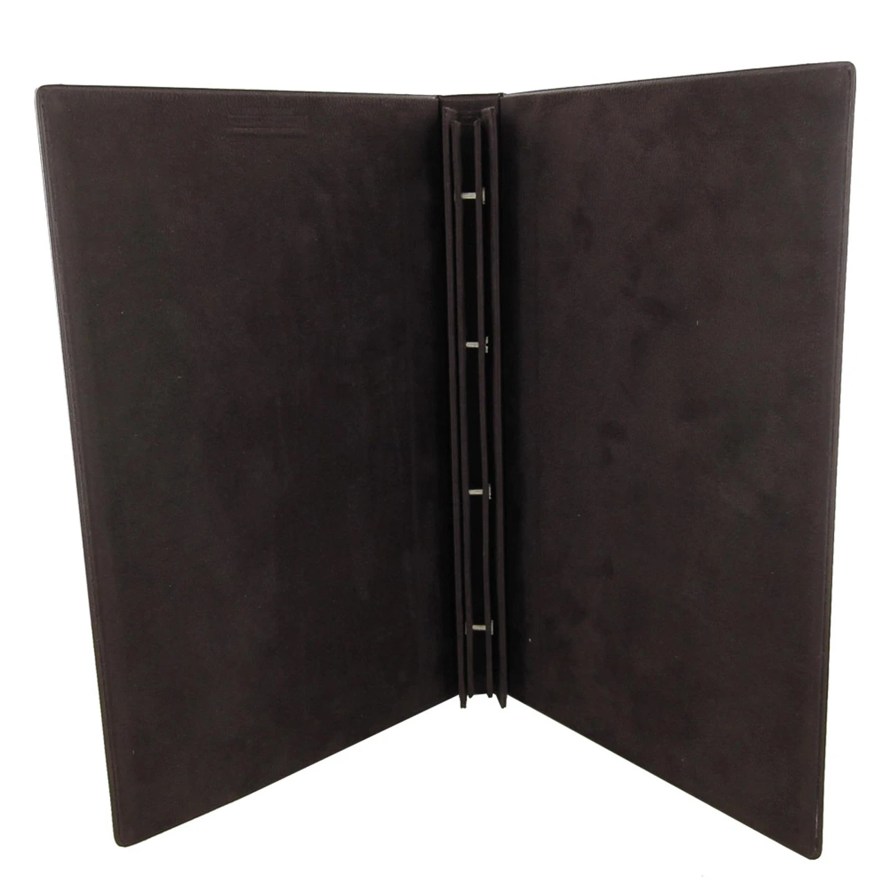 This set of two elegant menu covers come with a textured cover with a subtle unique marble pattern with a geometric design at the bottom. The interior features soft brown suede and a binder with four binding posts. The binding posts come .50 inch wide and screw to open and close. To protect the inner cover from the posts grinding into the material an extra sleeve is provided. Lovely, elegant, and comes in a two piece set these menu covers work with any style. Overall Length: 12 Inches.
