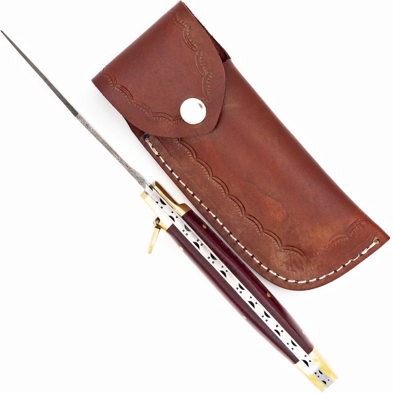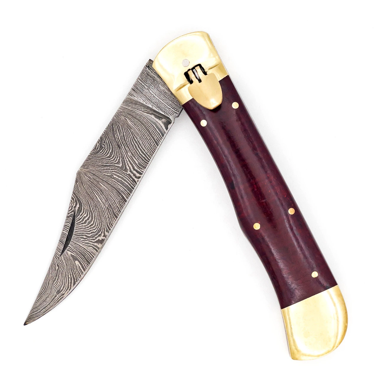 The Essence of Fear XL Automatic Switchblade is an automatic switchblade with a lever lock affixed to the guard for deployment of the blade as well as to keep the blade from deploying when not in use. The grips are micarta that has been dyed an ominous, murky red. The frame holding the grips is steel and the hardware as well as both bolsters are pure brass which compliments the dark red grips beautifully. The lever on this automatic switchblade is brass, too. If you press it down then the stunning Damascus steel blade will spring out from the left side of the handle and lock into the upright position. Simply press and hold the lever back down and you can guide the blade back into the handle. Flip the lever up and the blade cannot deploy. For even safer and easier carry you can then put the Essence of Fear XL Lever Lock Switchblade in the complimentary genuine leather sheath that it comes with and take it on the go. Overall Length: 10.76 Inches. Weight: 0.7 lbs.