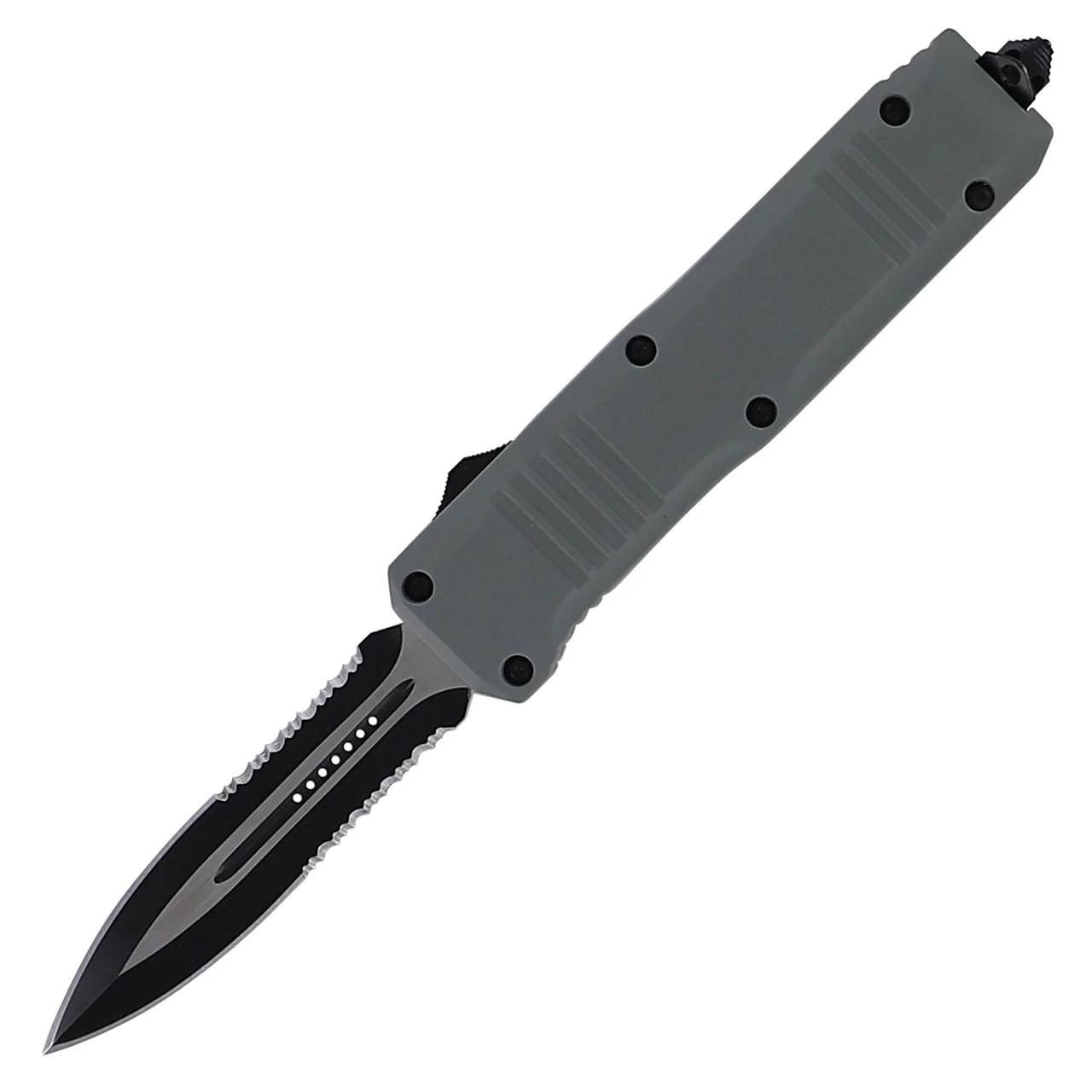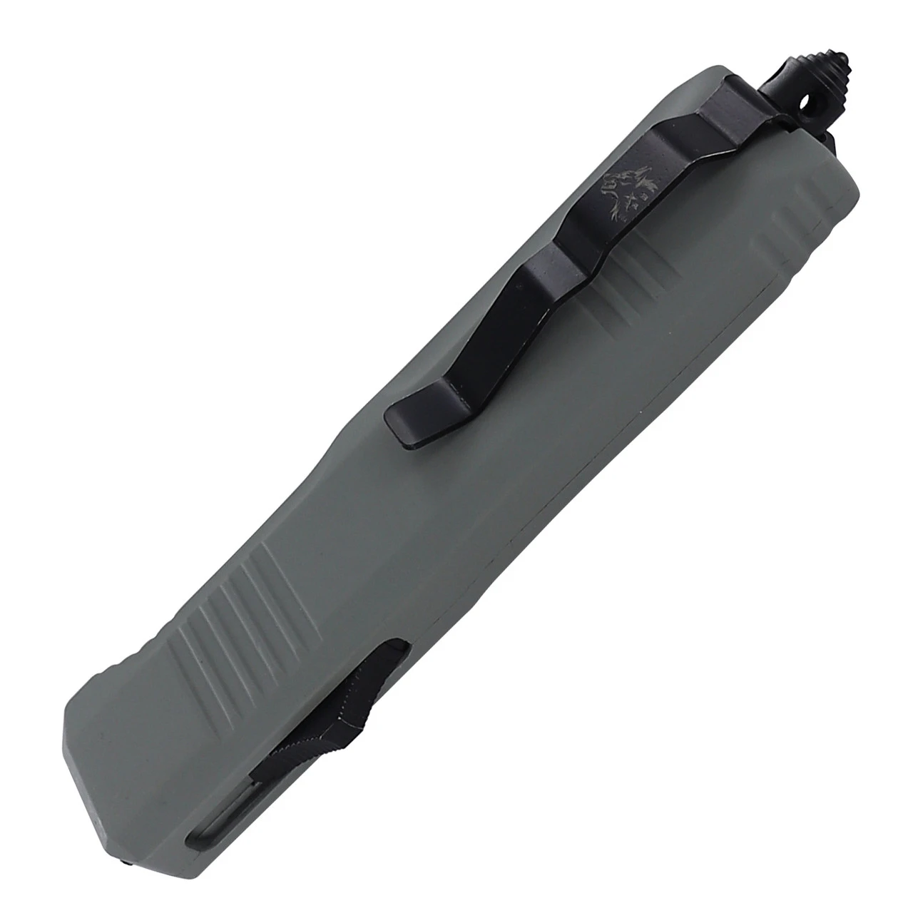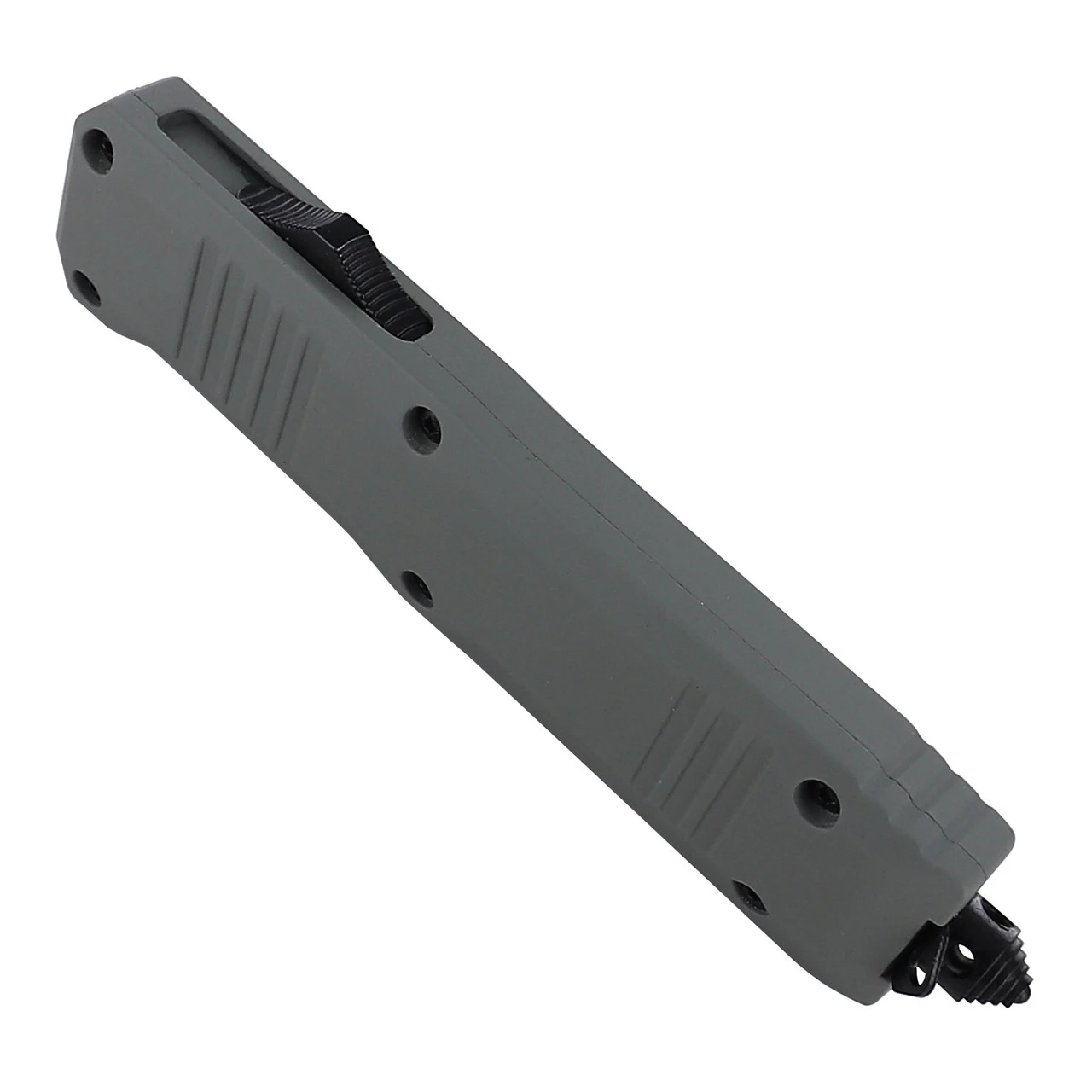 If you have a score to settle, this just may be the knife for you. This deluxe automatic out the front knife based off the hit action movie franchise was made for someone who has a large grip and a thirst for vengeance. This knife has a dual-action mechanism, meaning that you can use the thumb slide on the side of the handle to eject and retract the blade with ease. The black and silver blade is forged from stainless steel into a spear point with partial serration. 7 small holes are cut into the blood groove for decreased weight and added detail. Zinc alloy handle with a matte grey finish, and held together by six large black hex screws. A black pocket clip and emergency glass breaker are located on the bottom of the handle. Also included is a black nylon sheath that you can attach to your belt.