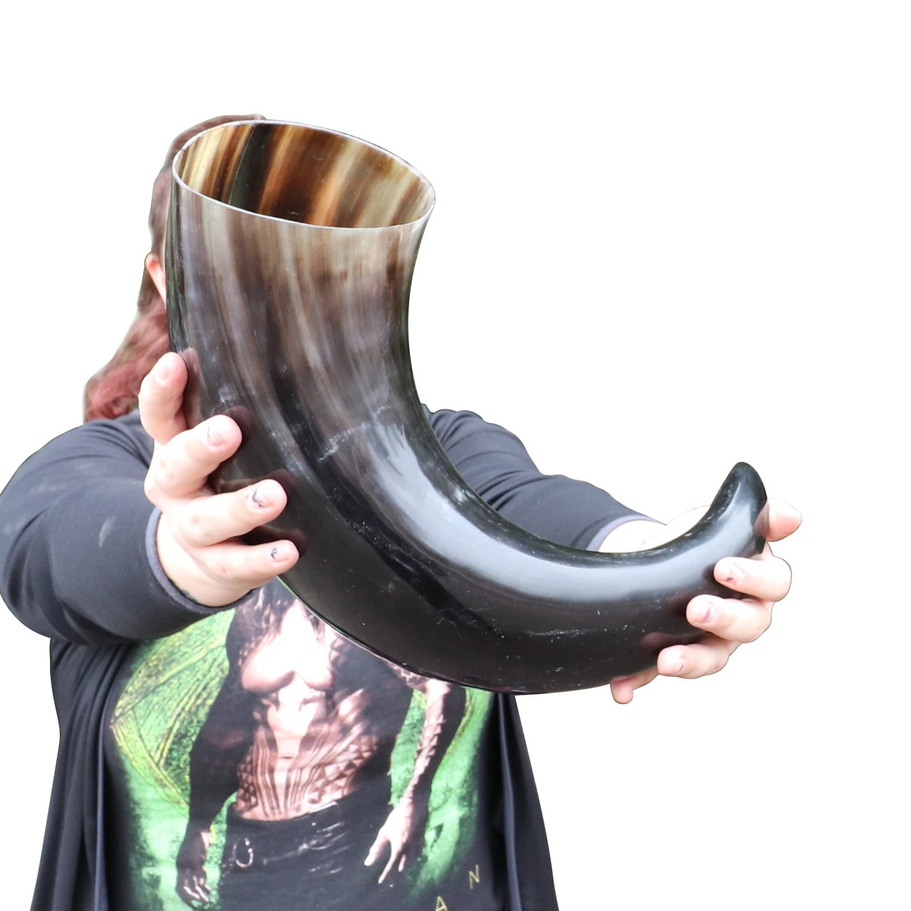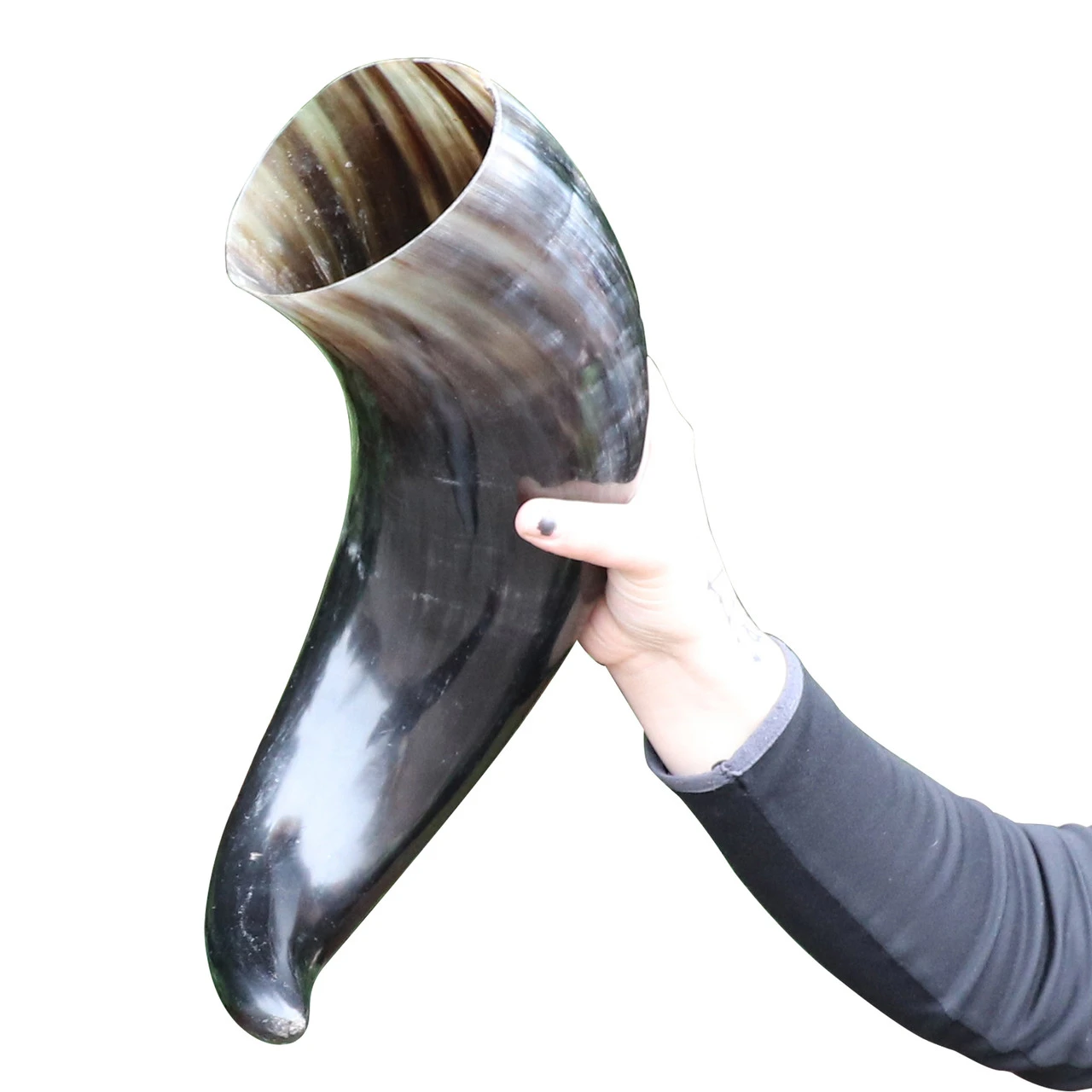 All-natural buffalo horn is hollowed by hand and carved to create this authentic drinking horn. Each horn is individually crafted, between 20 inches and 23 inches long. No two are the same. They can hold about 1100 ml to 1400 ml of water, wine, beer, ale, etc. The exterior is polished to a smooth shine. Coloring of the horn varies according to how it was grown in nature. Mostly it is black and calcium white. Drinking horns were traditionally used in many parts of the world. Sometimes ceremonial, and often as an everyday drinking horn. What is unique about the horn, it cannot be set down on a table until it is empty. Ensure a guest drinks all of their wine with one of these natural drinking horns. Please clean the horn before using. Overall Length: 20 Inches to 23 Inches, Estimated Capacity: 1100 ml to 1400 ml