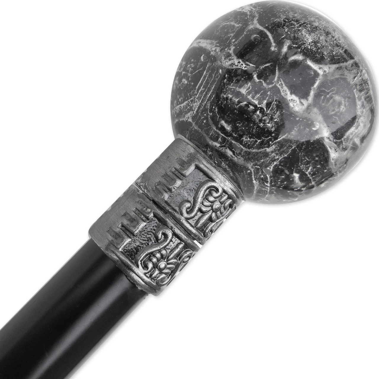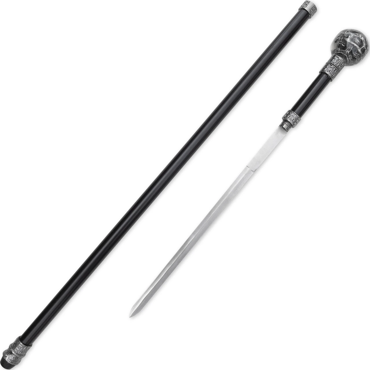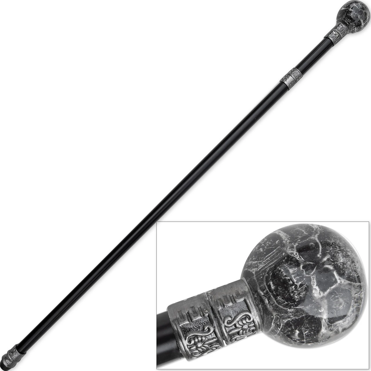 This gorgeous gothic walking cane features a globate resin handle and a black matte stainless-steel shaft. Inside the orb handle are 4 maniacal skull faces. Unscrew the shaft to reveal a pointed 15.5-inch blade with a factory edge. The blade features a ridge line down the middle, making it a dagger style. The ornate cap and tip of the shaft is a stainless steel with a rubberized tip for balancing when walking. This is a truly eye-catching piece that will be a perfect addition to any collection.