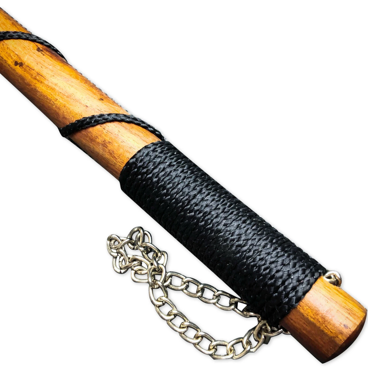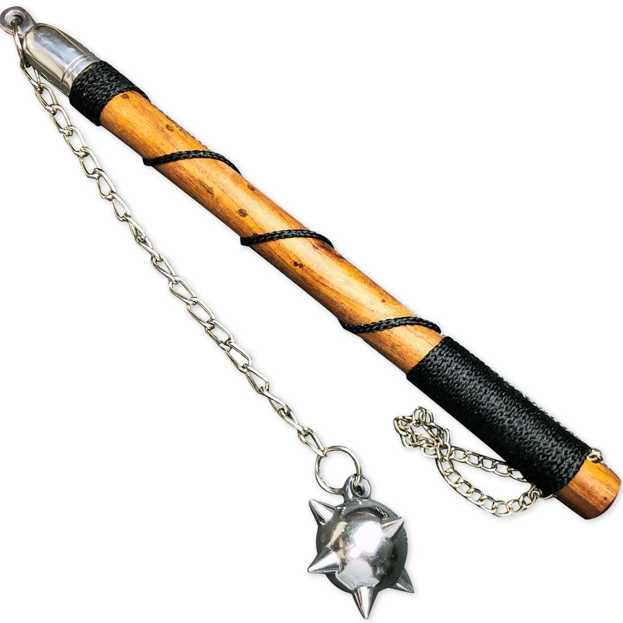 Prepare for bloodshed when equipping this deluxe medieval replica spiked flail to your arsenal. This barbaric flail consists of a 25-inch wooden shaft connected to a long chain that ends with a solid steel spherical striking head. A black nylon cord is wrapped around the handle for a more authentic feel. 22 lethal spikes are included to screw into the striking ball to make this a very dangerous weapon indeed. Be aware of your surroundings when swinging this guy around or you end up taking an eye out!