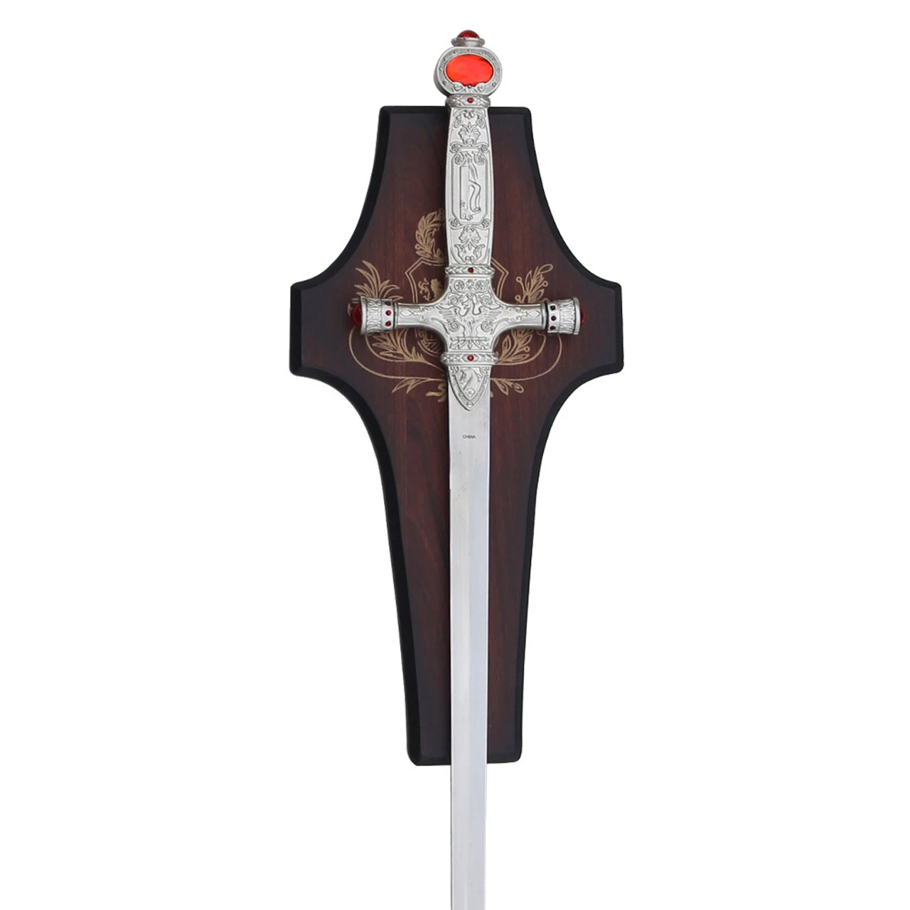 This lovely sword is replicated after the famed sword in a popular wizard movie. It comes with faux rubies to match the house it represents. It is a symbol of bravery and courage even though it does not have its name sake on the blade. The blade is slender with a mirror polished finish and made from stainless steel. The handle is made from aluminum alloy with a phoenix in the center of the cross guard and a wizard on the upper handle. The locket just below the hilt features a detailed unicorn as in the wizarding world unicorns are sacred creatures for the incredible magical abilities. This sword comes with a wooden plaque to display your sword on the wall for everyone to see. At the top the plaque has a golden crest with a lion.Overall Length: 31.50 Inches.