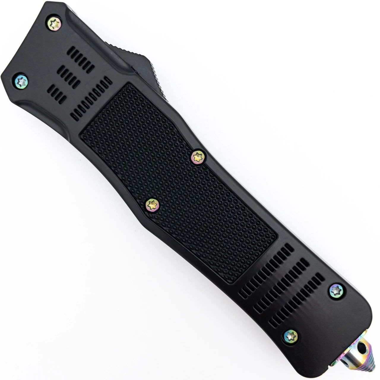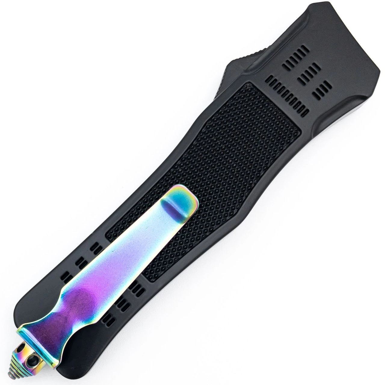 The attractive tanto-style blade of this heavy-duty OTF knife is constructed of stainless steel with a beautiful titanium rainbow finish that has been carefully laser etched with a gorgeous feather-like design. Sporting titanium hardware, including a steel pocket clip and emergency glass breaker, this knife is a functional work of art. The dual action allows you to use a slider trigger to propel the blade forward as well as retract. The handle is constructed of zinc alloy and specially designed for larger hands, complete with a diamond textured finish for optimal grip. Included with your knife is a black nylon sheath with belt loop and buckle closure. Overall Length: 9.5 inch, Blade Length: 3.75 inch