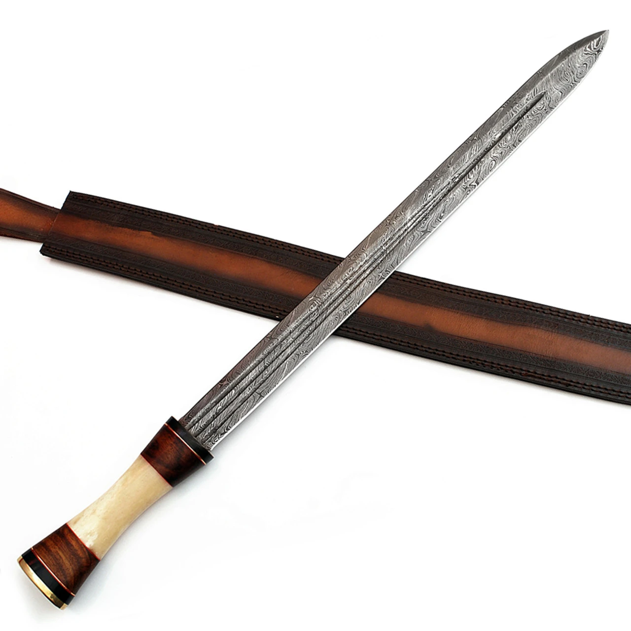 This is the Greek Spatha Damascus Steel Sword which features a well made wooden handle which is adorned with bone and brass fixtures. The blade offer a true Damascus forged steel with a double edge, factory sharp, finish which includes a ridge line with three blood groves on both sides. The blade has approximately 176 layers with a temper hardness of around 54-55 HRC. This Damascus Sword comes with a dark brown, two tone, real genuine leather sheath with belt loop and includes two reinforce studs for a sturdy hold. Overall Length: 28 Inches