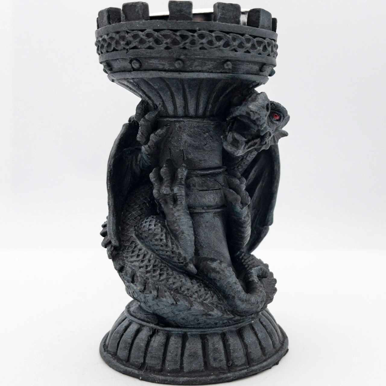 The Guarded Flame Tea Candle Holder Dragon Candlestick is a 4.5-inch candlestick shaped like a castle tower with a dragon climbing it. The candlestick has a dark gray finish, tower, dragon and all; however, there is one spot of color on the piece, the dragon’s eyes. The eyes of the dragon on the tower are a striking, almost-luminescent red. The top of the tower is where the candle sits. This candlestick holds tea candles approximately 2 inches in diameter. This display piece is perfect for anyone who loves medieval themed items or loves a dragon theme. The Guarded Flame Tea Candle Holder Dragon Candlestick will add a dramatic flair to any room. Overall Length: 4.5 Inches. Weight: 0.5 lbs.