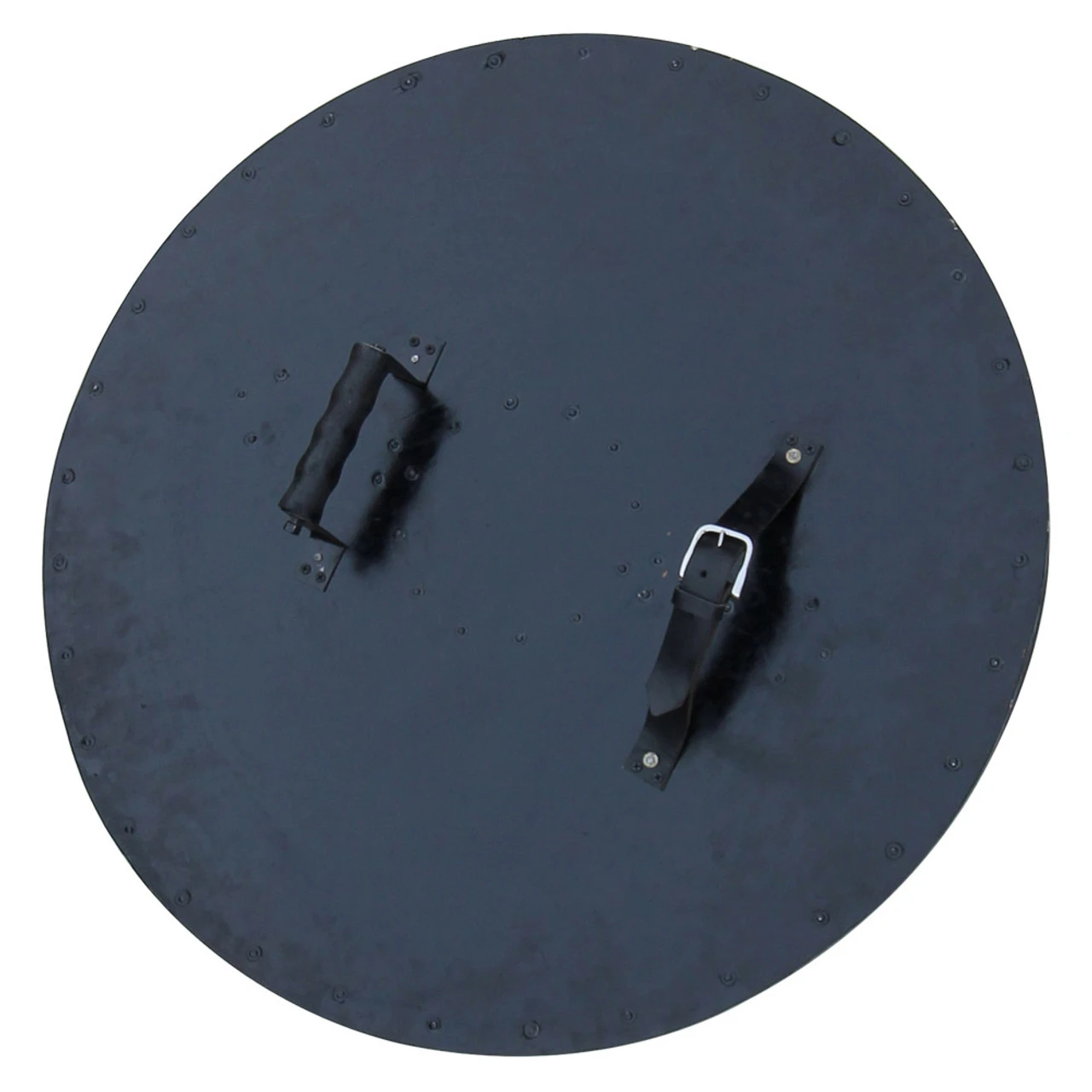 This Viking replica is absolutely stunning with a rich black cherry stain. The metal edges and shield boss are 14g mild steel and have been riveted on. Due to the material, this shield comes oiled. The back is finished in black with an adjustable leather arm strap and wooden handle. The dimensions of 29.75 x 29.38 and ½ inch thick. Overall Dimensions: 29.75 x 29.38.