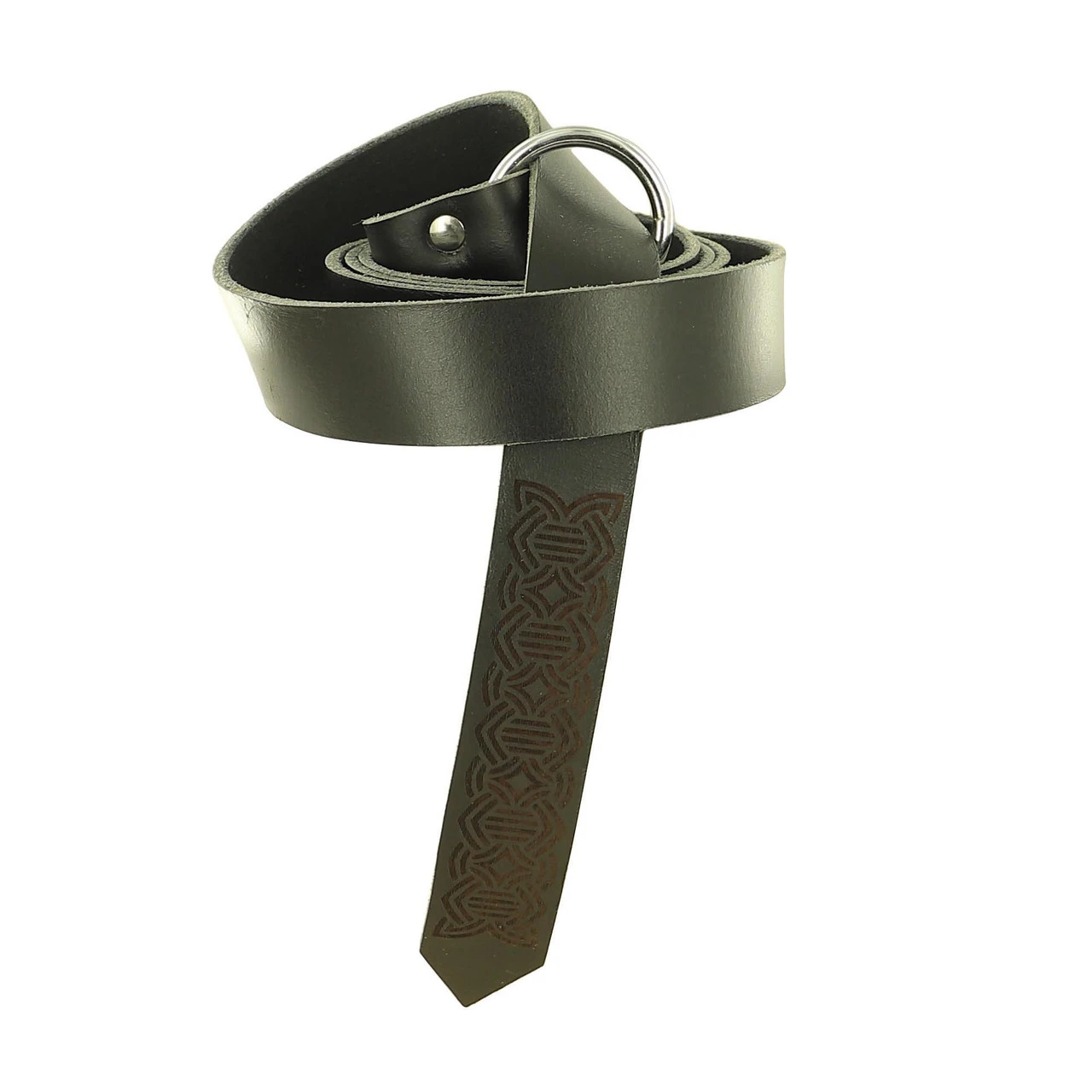 The Vikings loved patterned clothing and actually they loved patterned everything. Look at their culture, patterns and symbols are everywhere. Take a look at their ships, weapons, and jewelry; these pieces are ornate so it would not be a stretch to say that so were their belts. From what we know from excavations the men’s belts were made from leather and were usually long and narrow. Men wore tunics and trousers. Their clothes were fastened with belts and brooches. This belt is made from quality leather and has been dyed black; all hand stitched with a steel ring to knot your belt. The end that hangs features a Viking weave design. Hanging from a belt like this you could often find a drinking horn, seax dagger, belt pouch, and other everyday items. If you are trying to complete a costume for a re-enactment, this belt would look great against an everyday tunic.