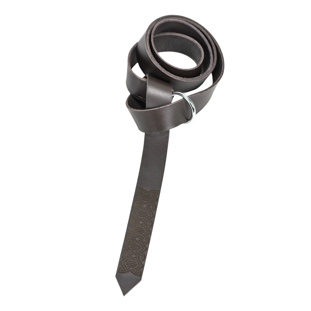 This belt is made from quality leather and has been dyed brown; all hand stitched with a steel ring to knot your belt. The end that hangs features a Viking weave design. Hanging from a belt like this you could often find a drinking horn, seax dagger, belt pouch, and other everyday items. If you are trying to complete a costume for a re-enactment, this belt would look great against an everyday tunic.Overall Length: 66 Inches.