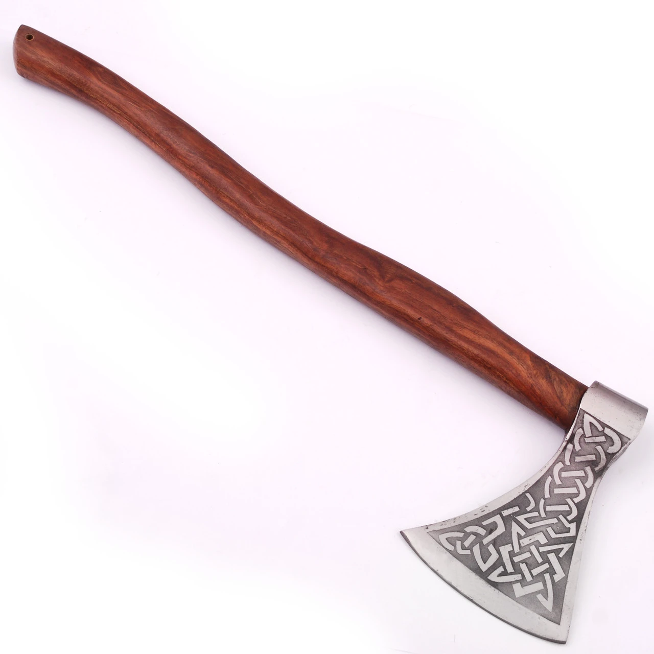 Nordic warriors are often viewed as nothing but savages, but this is simply not the case. In fact, most Vikings had great respect for their weapons, and would often adorn them in elaborate decorations. This replica axe is our take on what a traditional Viking battle axe would look like. The head of the axe is made from carbon steel, engraved with an intricate knot work motif. This axe comes sharpened and ready for action, whether that be chopping wood or chopping off heads. The handle is made from resilient sheesham wood that has been contoured and stained a beautiful rustic brown. A lanyard hole located at the bottom of the handle allows you to attach a cord or string. *Also Available with Small Knotwork Motif Engraving on Handle.