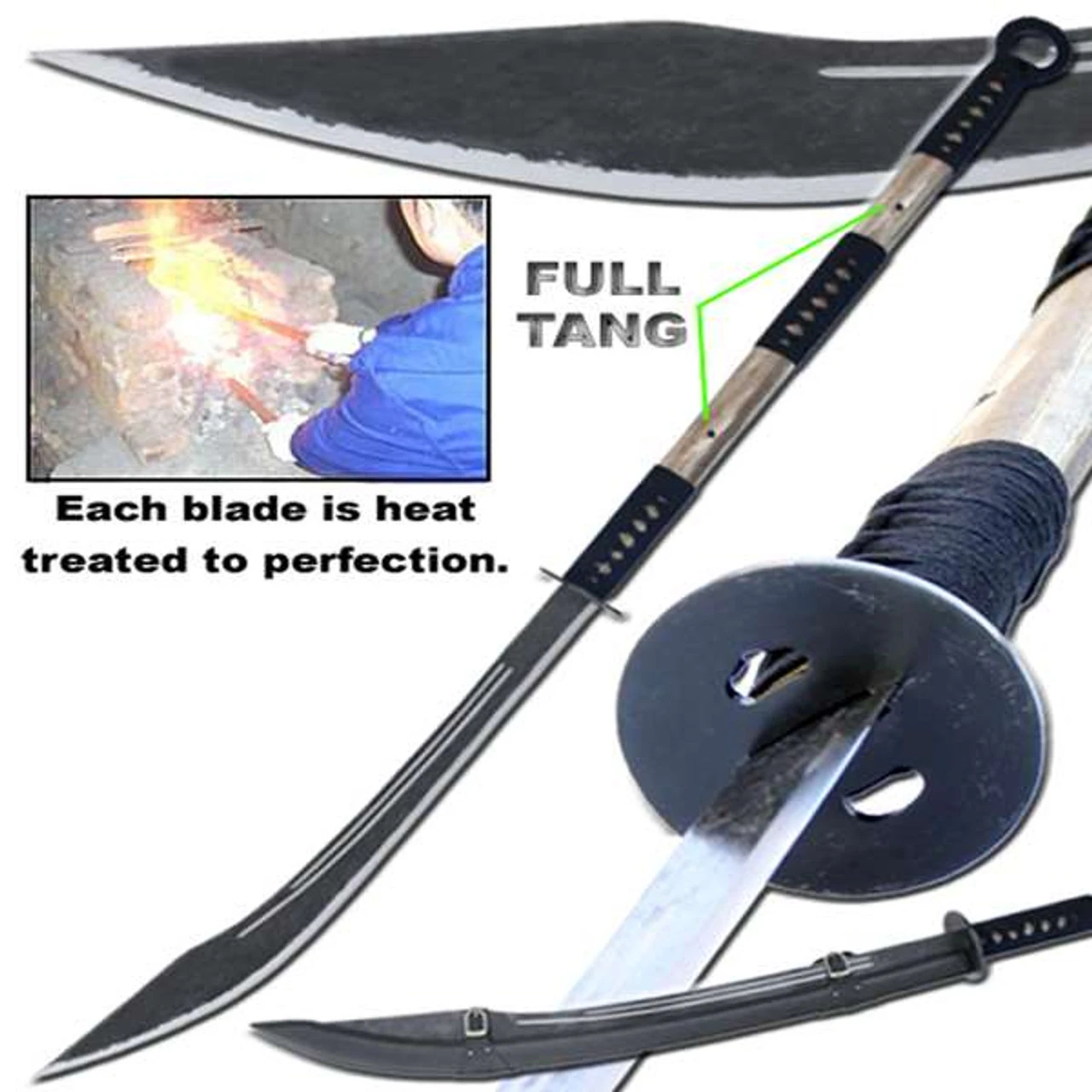 Due to its massive height and extended reach, the Naginata was the weapon of choice for battle against horseman during Feudal Japans Warring States Period until the introduction of firearms. Measuring in at a massive 53 inches in overall length, this Japanese Samurai Warrior Naginata is surprisingly light at just 4 pounds and very easy to wield and maneuver around with. Constructed from the highest quality high carbon steel that is heat treated to perfection and featuring an antique finish for a true battle-worn appearance, the blade is 25 inches long and comes equipped with double fullers- one fuller is 14 inches long while the second is 11.5 inches long. A FREE black leather snap fastened sheath is included. Overall Length: 53 Inches Blade Length: 27 Inches Blade Thickness: 2.5 mm Handle Length: 26 Inches Handle Material: Nylon Cord Wrapped Wood Includes: Black leather snap fastened sheath, 14.5 Inch and 11.5 Inch fullers, Antique finish.