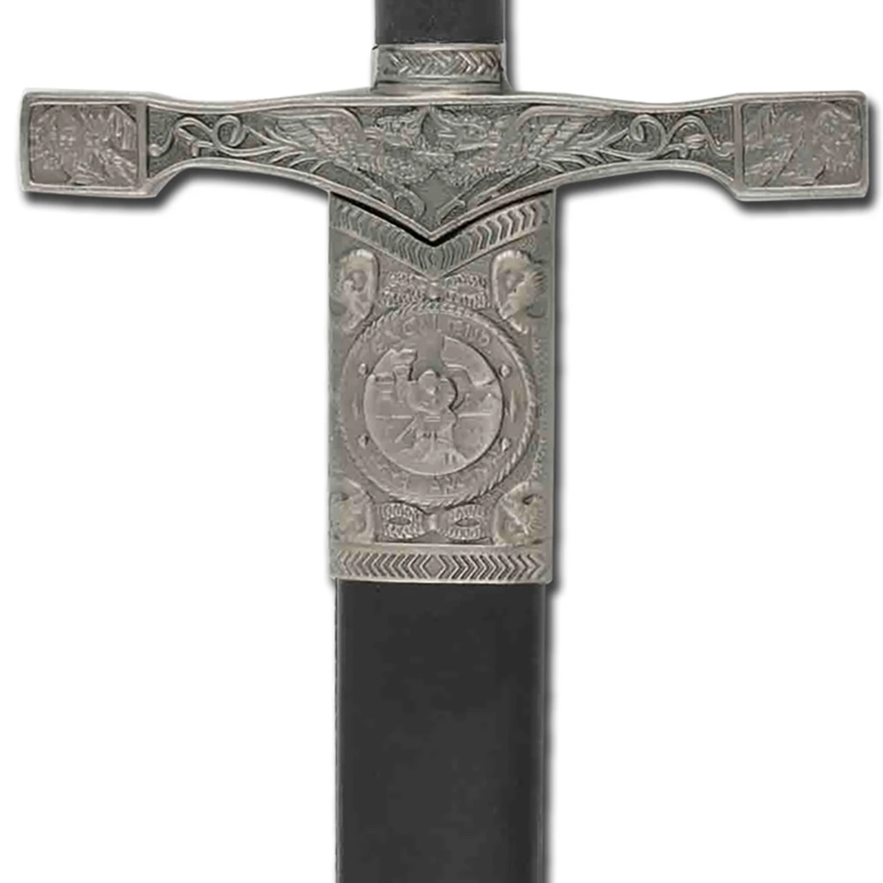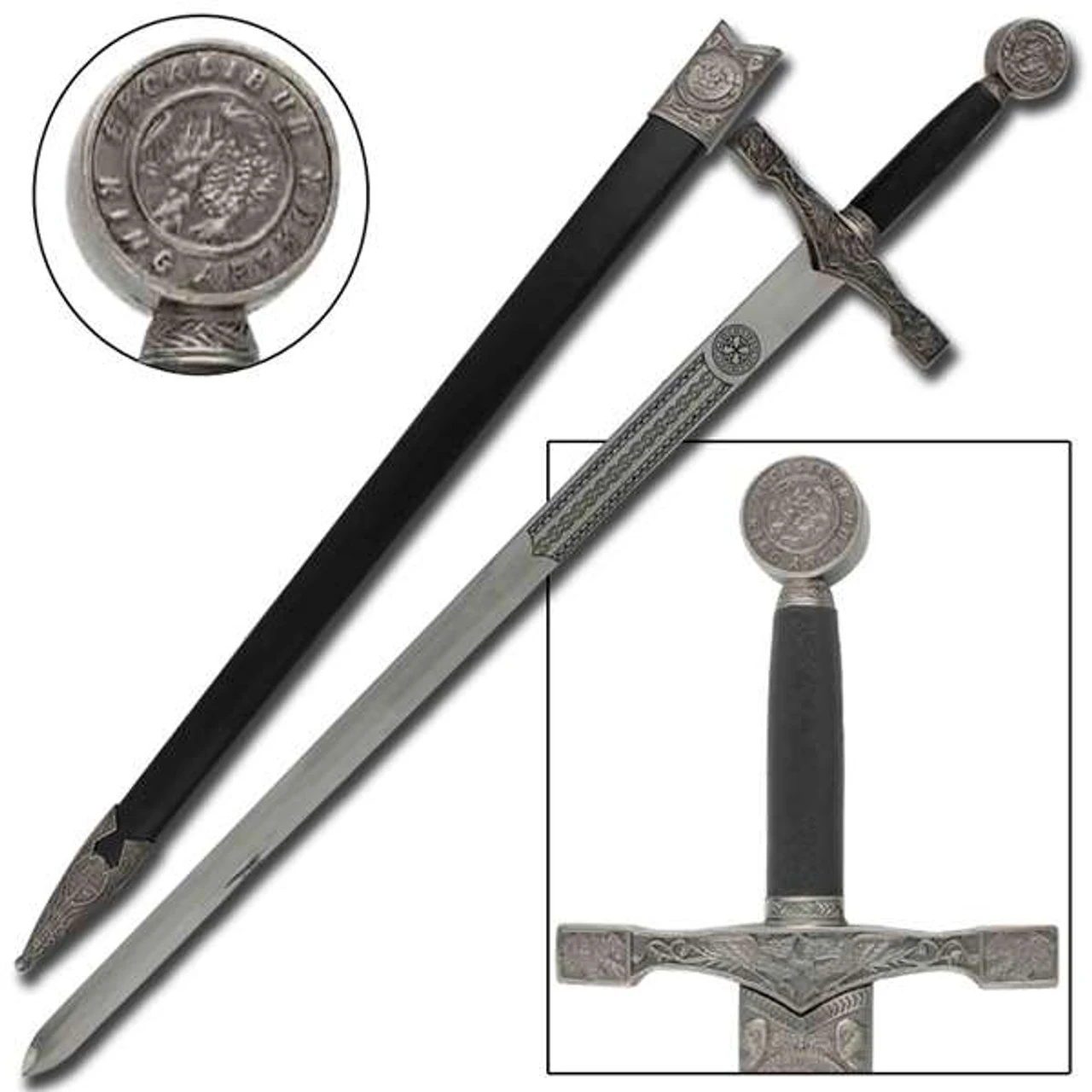 This representation King Arthurs features a 23 inch stainless steel blade and comes unsharpened with a Celtic pattern running along the ricasso into the ridge. The guard features an intricate design with vines and dragons while the pommel also shows a dragon in the center and scroll work around the rim bearing the inscription Excalibur King Arthur. This inscription also appears on the leather wrapped wood scabbards locket, encircling an image of a young King Arthur pulling the sword from the stone as mystic serpents look on. The scabbards chafe features an ornate design highlighted by a shield bearing a coat of arms featuring a cross and several classic English symbols including the famous three lions and the Tower of London.