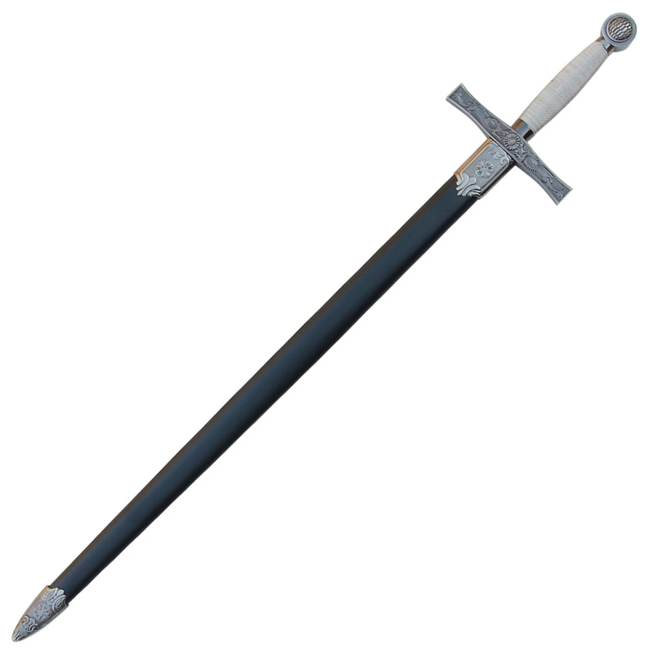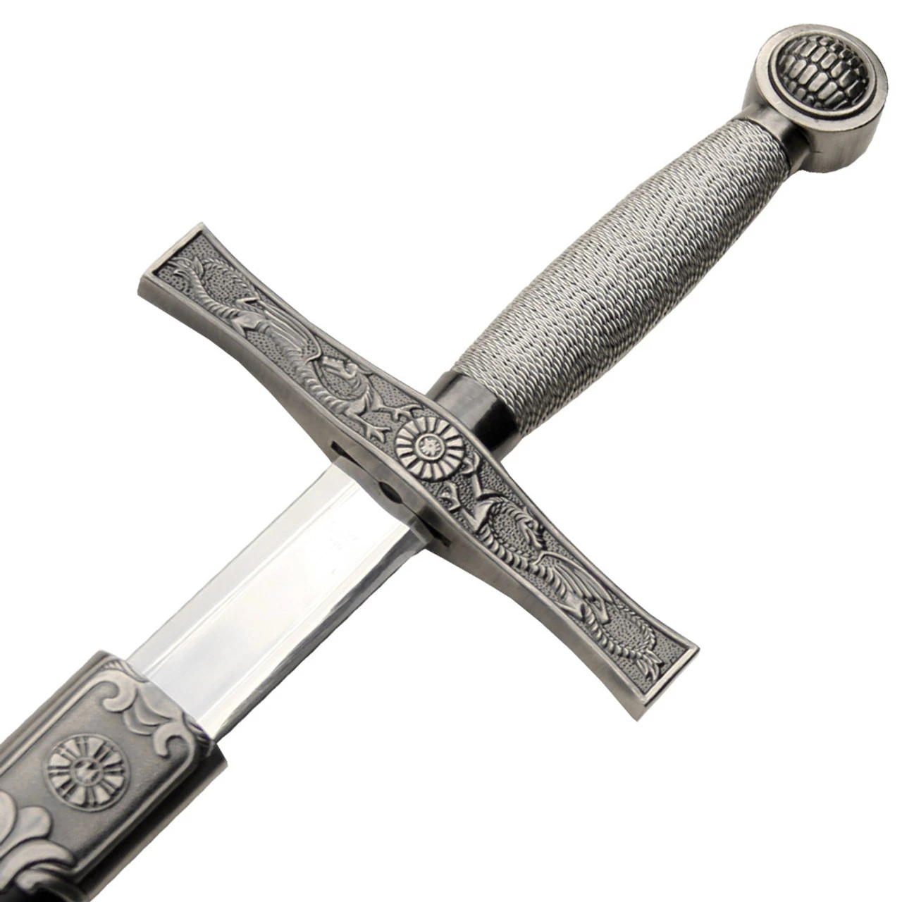 Excalibur sword featuring ornate imagery on the guard and the scabbard, the guard features two dragons bracketing an engraving of King Arthurs Round Table. The scabbard has intricate scroll work engravings on the chafe and locket along with further images of the Round Table. Slightly sharpened with a sharp point, the blade is constructed from 440 stainless steel with a ridge running along its length. Providing a solid grip, the handle of the sword features a metal wire wrap while the pommel of the sword is solid with a cut out pattern on an orb and an antique finish.
