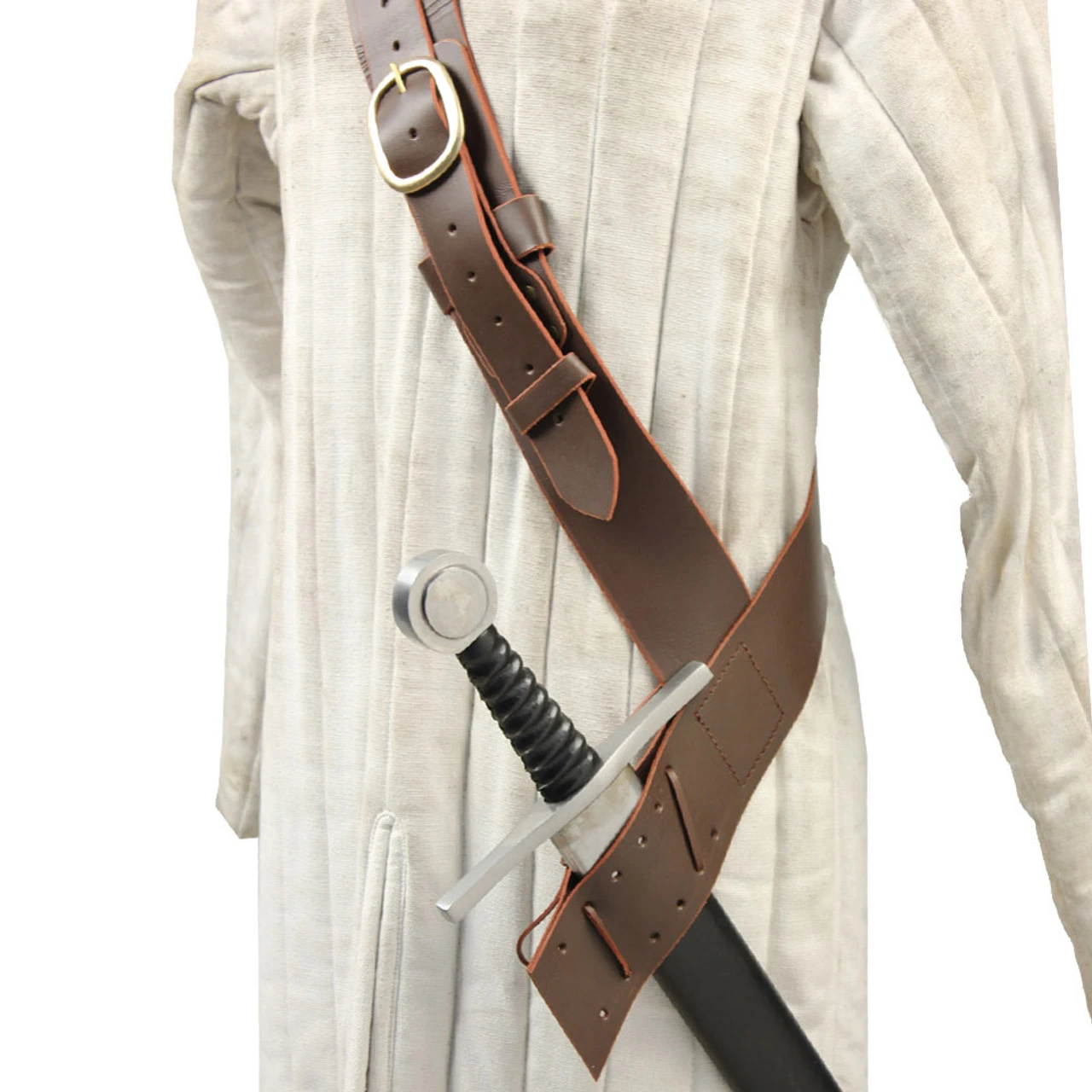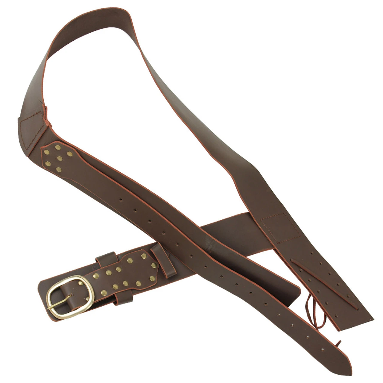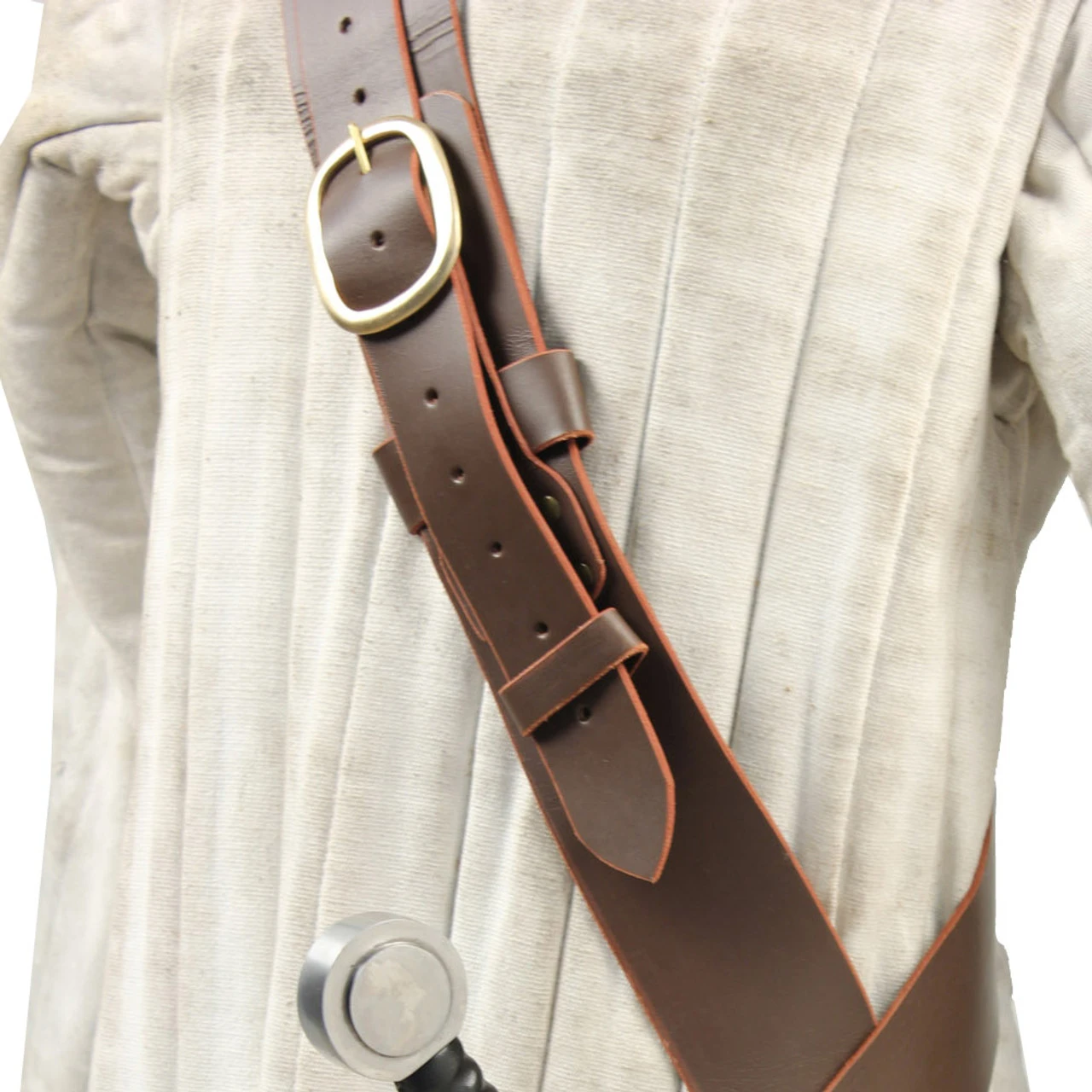 The baldric belt hangs from the shoulder across the chest to suspend the sword from the waist at the opposite side. This Baldric is constructed from tough real genuine brown leather with brass rivets and buckles. The frog portion is adjustable with laces so you can lace it up to fit your sword. The shoulder strap can also be adjusted to your likeness. Overall length is 60 inches.
