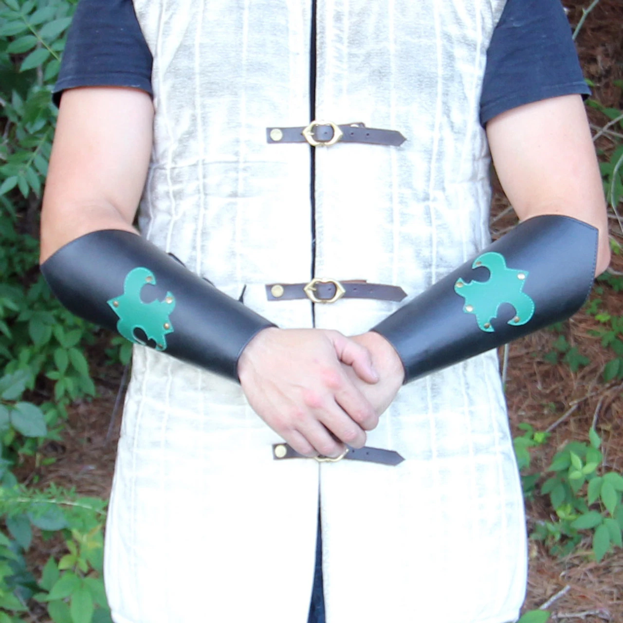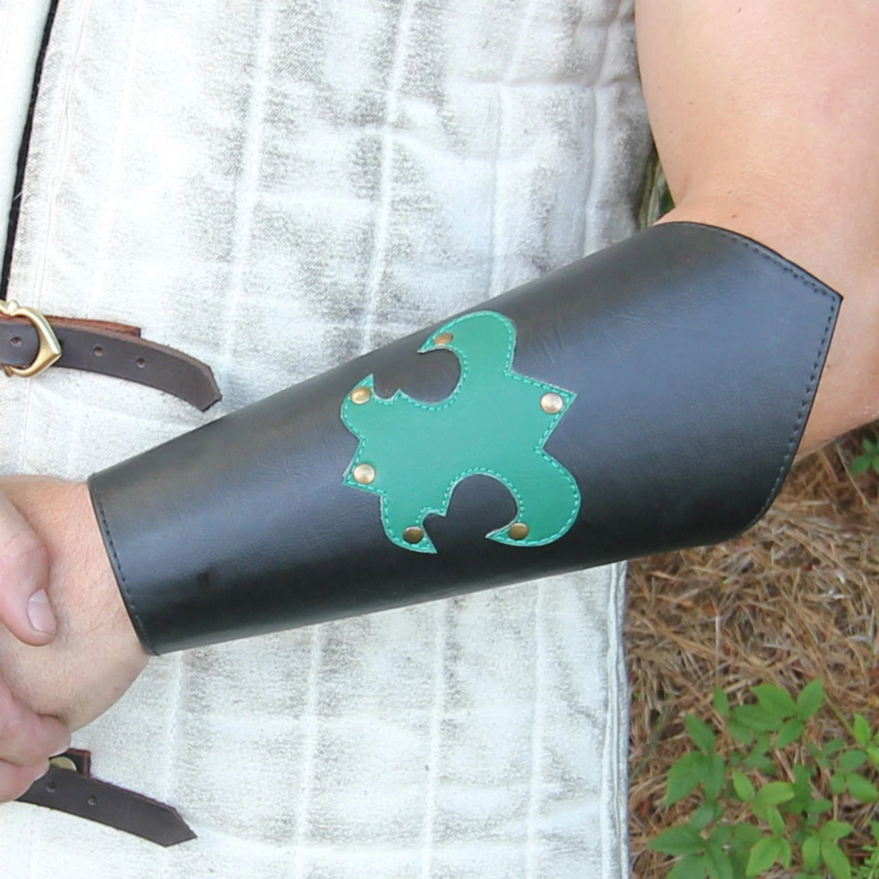 Ready yourself for battle with these arm bracers made of genuine black leather, adorned with a green fleur-de-lis decoration of the forearm area with brass rivets.