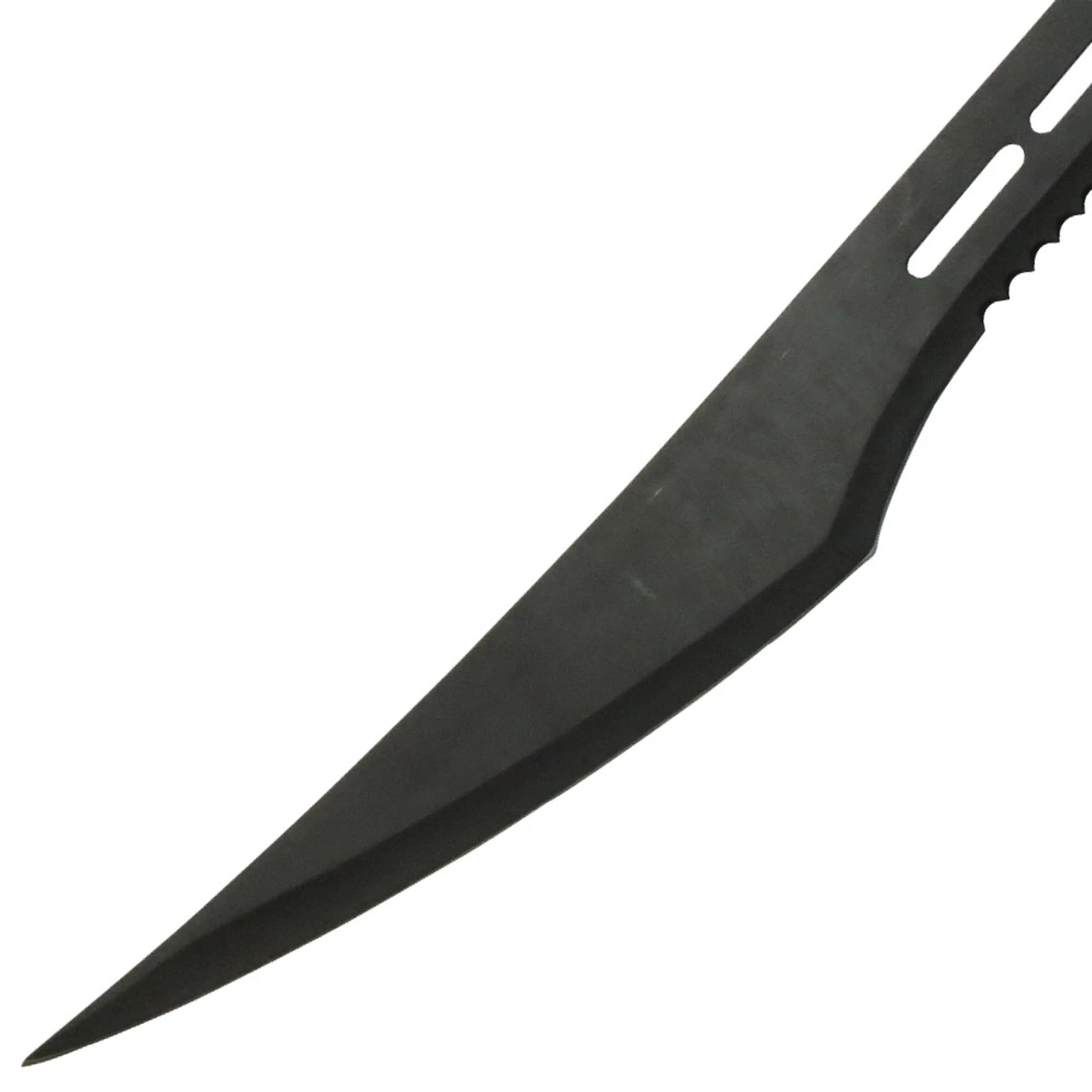 This is one solid piece of cold, hard, stainless steel with heat treated black anodize baked finish. The neon green nylon cord wrapped handle adds a sleek stylish look with easy maneuverability while the blade offers a neon green imprint of Living Dead with the bio-hazard symbol and ZK in the middle which means its only meant for Zombie Killing. The wicked blade is constructed with fantasy cut outs, teeth like serrations, and a piercing point. It slides superbly into a durable black nylon blade sheath with an adjustable shoulder strap. It has a 27 inch overall length.