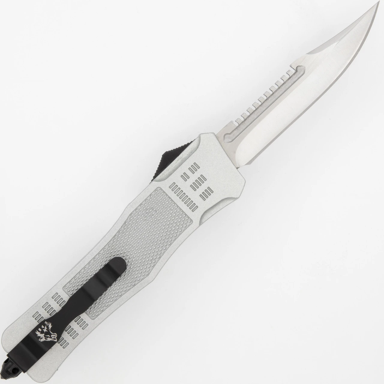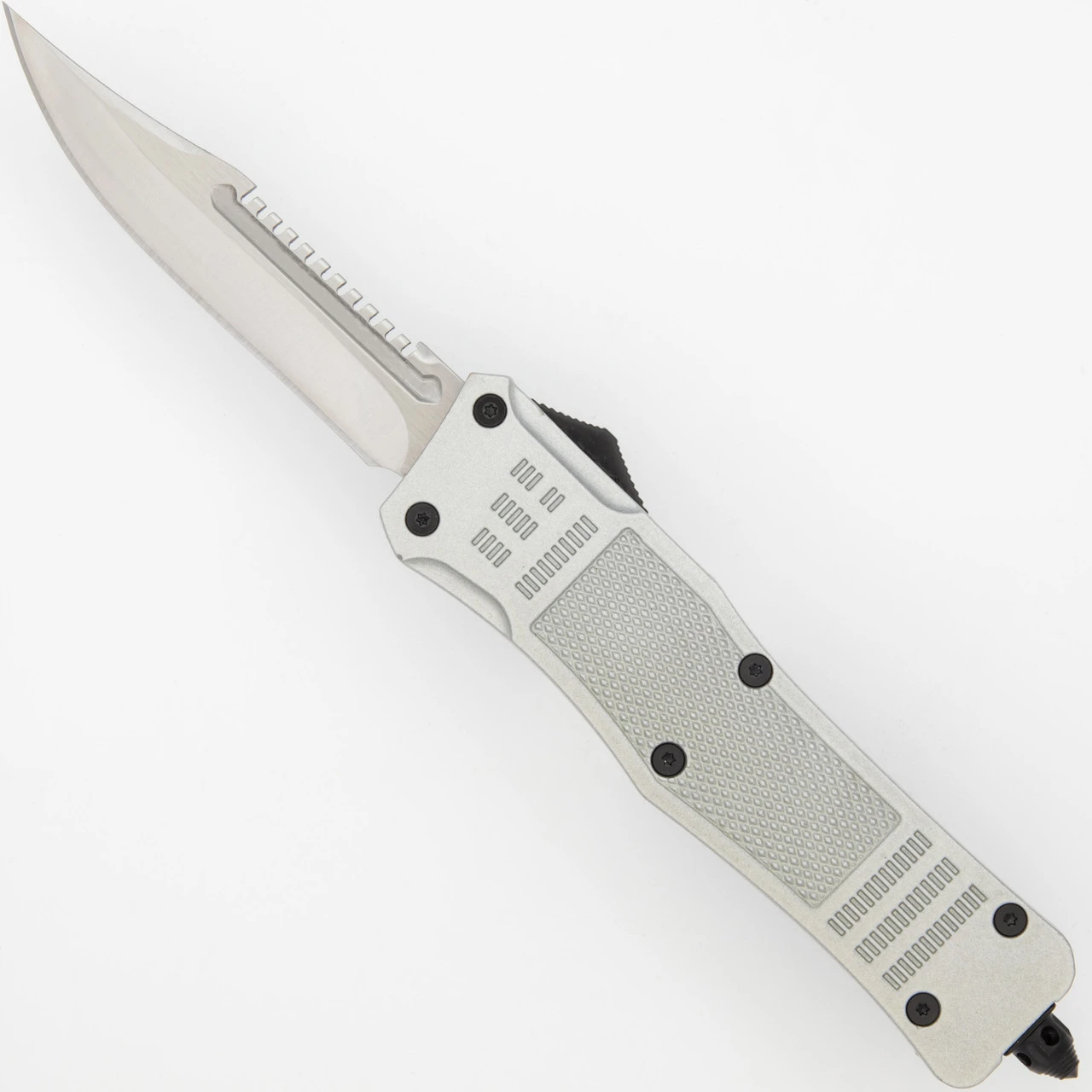 Until then, the Magnetic Field Automatic Out the Front Knife won’t fail you. This automatic knife is an out the front knife which means that while retracted the blade is fully concealed inside the handle and, when deployed, the blade shoots from the end of the knife straight out instead of swinging out like in switchblades and stilettos. The tanto blade has partial serration halfway down the spine of the blade as well as a fuller to reduce weight and increase accuracy. The handle of the Magnetic Field Automatic Out the Front Knife is textured for grip and features futuristic texturing at the guard and pommel. At the end of the pommel this knife features a glass breaker too for emergency situations. The Magnetic Field Automatic Out the Front Knife comes with its own black nylon sheath with a belt loop and quick release so protection really is a close as flipping a switch.