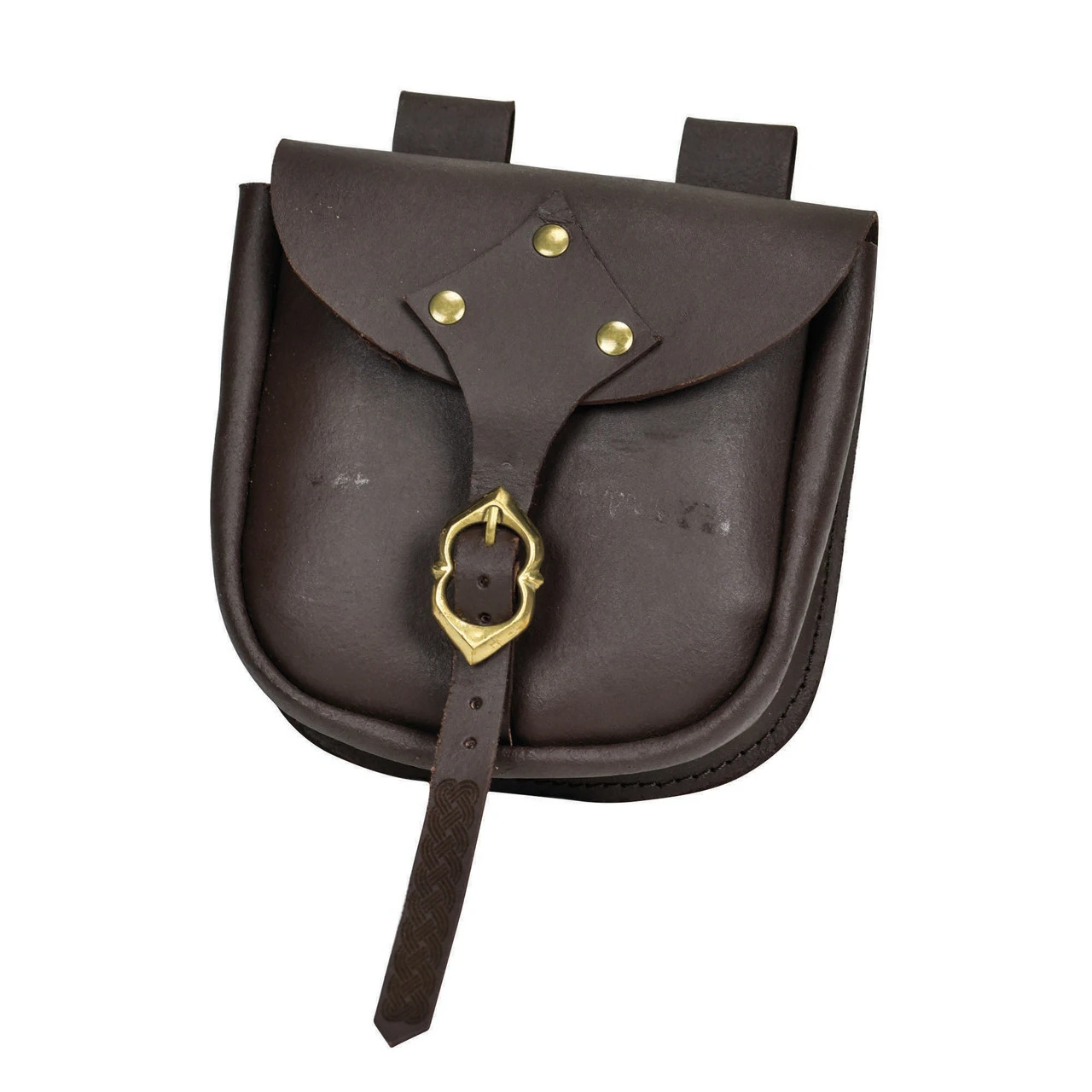 Strap this medieval pouch to your belt and take it on all of your exciting adventures. Who needs a wallet when you have a pouch large enough to fit all of your needs? This pouch will securely hold your phone, keys, cards, bills, coins and small trinkets. Made from premium brown leather that will last for all of your adventures. The buckle closure is made from pure antiqued brass with an adjustable strap that features a knotwork design. Perfect for LARP, costume, cosplay, theatre, or just to carry around on the daily!