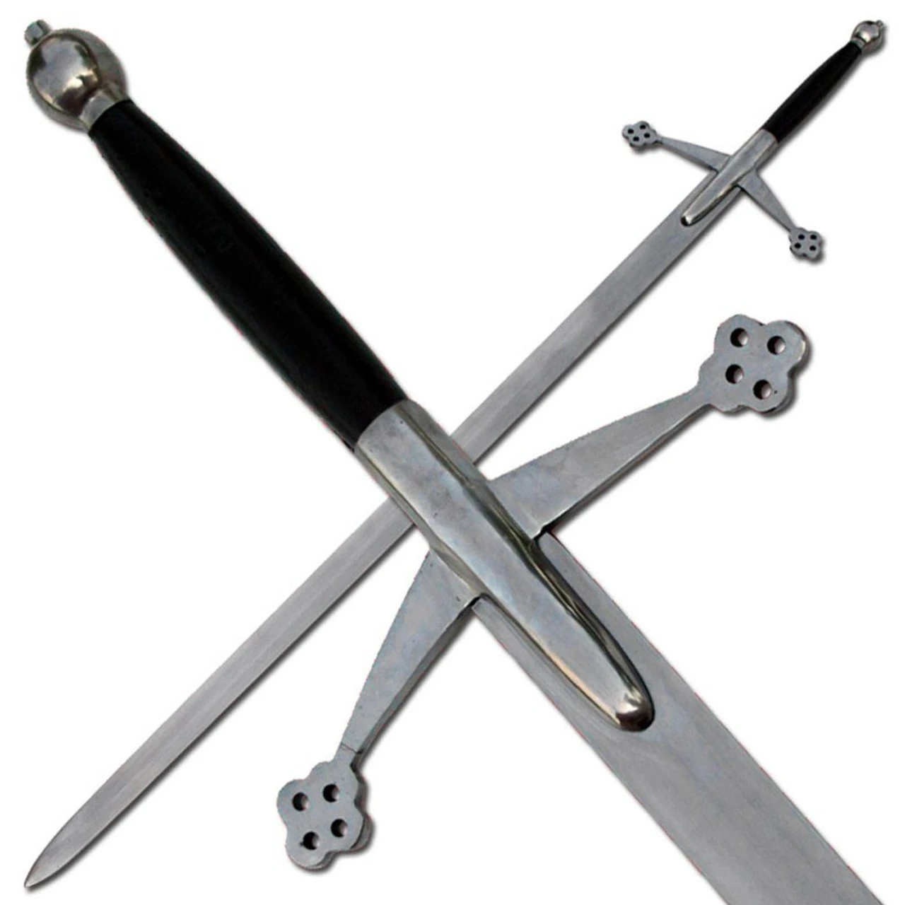 Our claymore is classic in its design, with distinctive down sloping arms terminating in a quatrefoil design and langets running down the center of the blade. The leather-covered grip is topped by a globate pommel. The sword is overall 54 inches long, the finish closely replicates that of the original museum piece. It has a carbon steel blade, and chrome polished hand guard. Can be professionally sharpened. Overall Length: 54 Inches. Blade Length: 42.375 Inches. Handle Length: 15 Inches (Including Guard). Guard Width: 11.25 Inches. Blade Material: Carbon Steel (Unsharpened). Handle Material: Wood Wrapped with Black Leather.