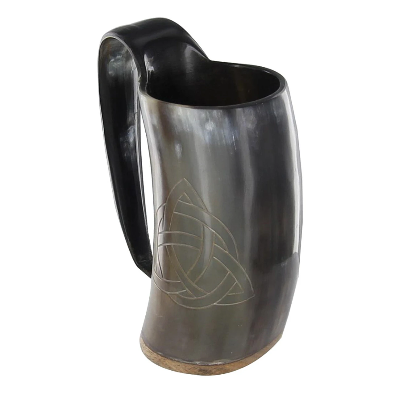 The Triquetra, or the Trinity Knot, is most notably known for meaning the holy trinity in the Celtic church, although it has its own meaning in many different cultures. This mug is adorned with this symbol, hand-carved onto the side. It also features a sturdy handle and body made from 100% natural horn. The inside of the mug is coated with a food-safe sealant, which means it can and will be your new favorite drinking mug. The outside has a smooth glossy polish to give it a nice sleek look. It has a wooden base that has been sanded and carved to keep the mug steady on any smooth surface. Size and color vary, because every mug is made from all-natural horn, which gives every one its own uniqueness.