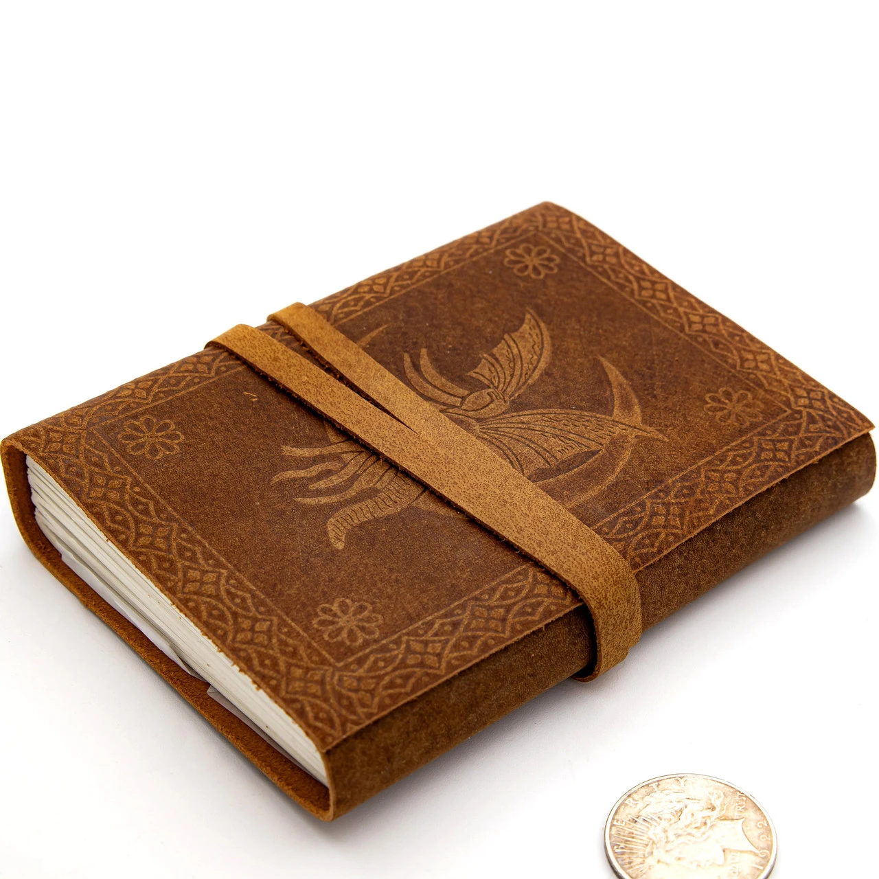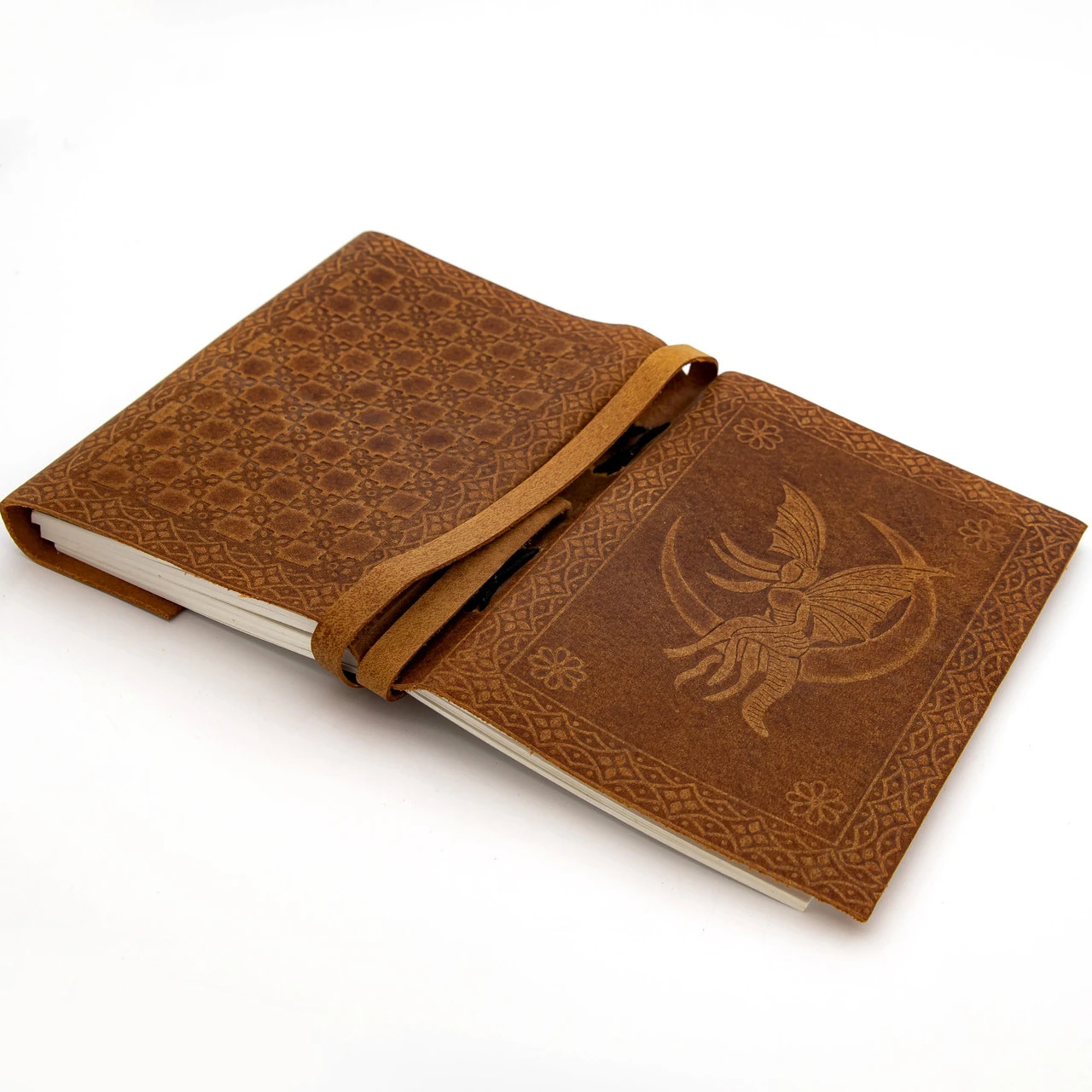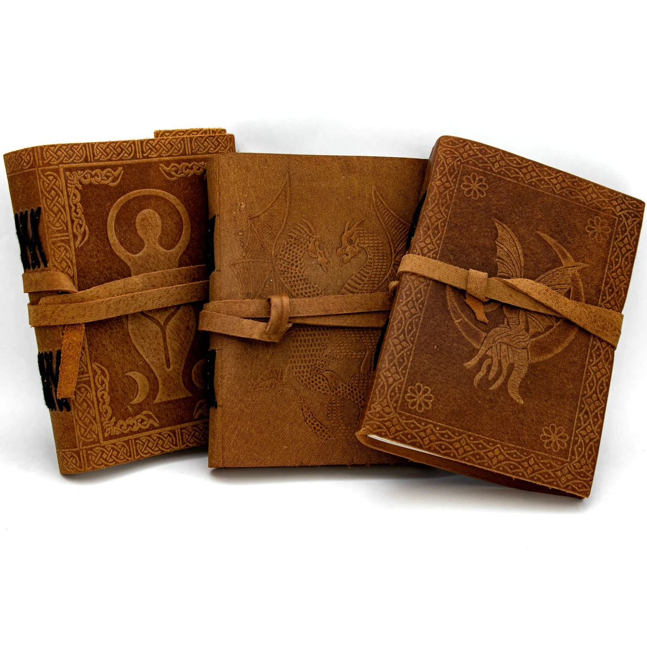 The scent of old books and the feel of leather in the hand is irresistible. The urge to write your own story in your own pen is even more so. The Old-fashioned Cursive Leather Bound Journals are completely blank and waiting for a story to be written. You have three options to choose from: the lunar fairy journal, the dual dragon journal, and the goddess of life journal. The imaged and patterns are embossed into the leather for maximum durability. The leather wraps around both sides of the book and ties around the width with a leather strap for depth of design as well as added protection for the pages. These journals are a good size with 7 inches in length and 5 inches in width. The spine is secured with black yarn stitching for a lovely accent and solid construction. Handmade with care, the Old-fashioned Cursive Journals are ready for your story. Overall Length: 7 inches. Weight: 0.75 lbs.