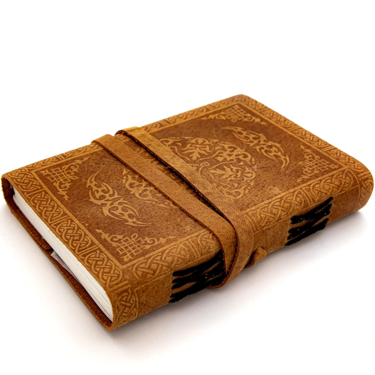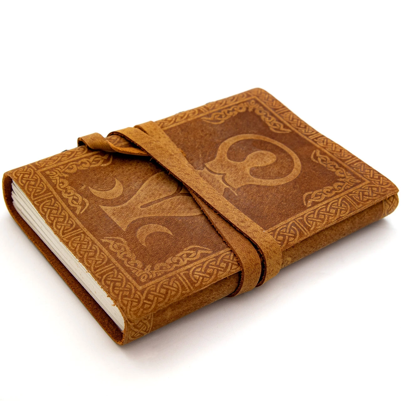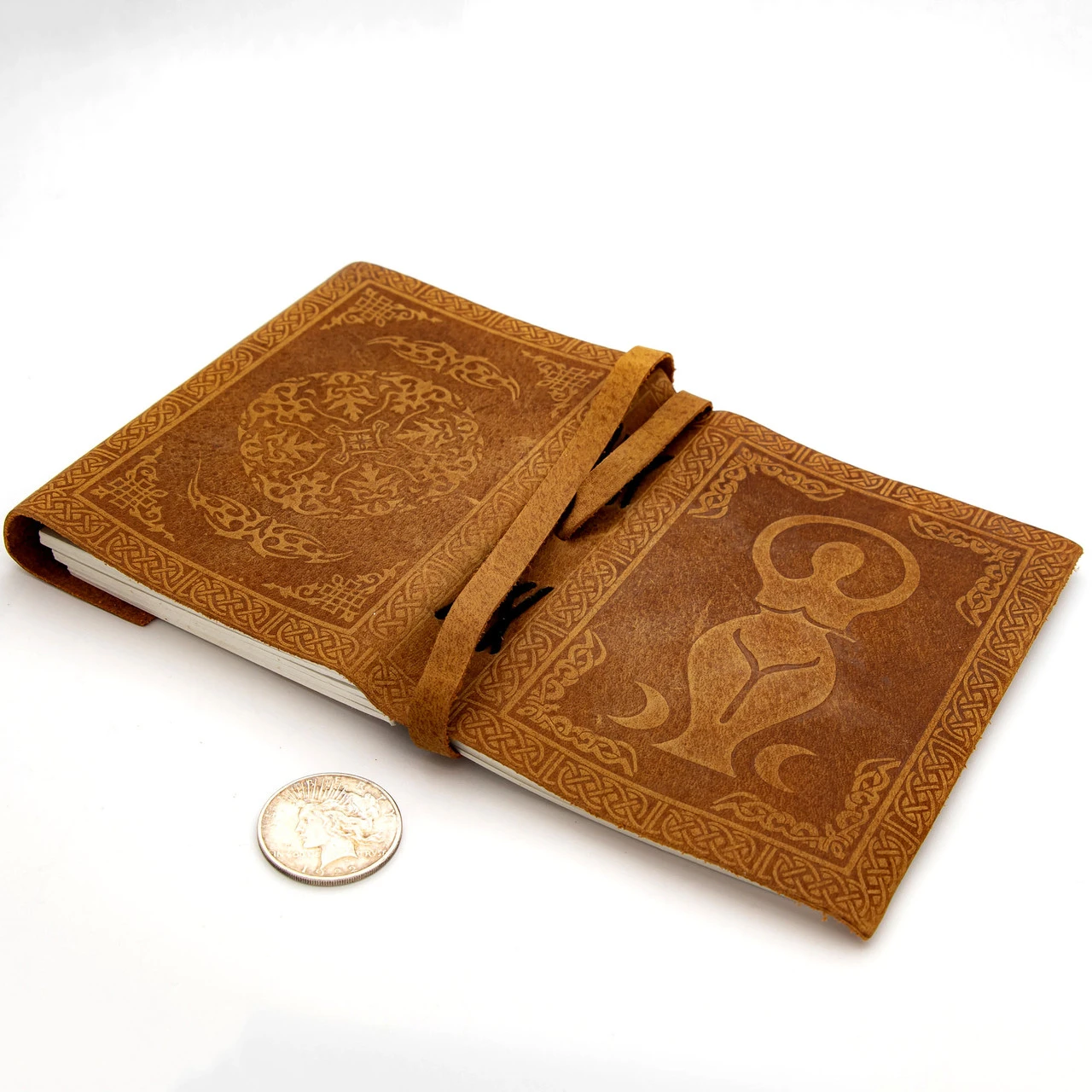 The scent of old books and the feel of leather in the hand is irresistible. The urge to write your own story in your own pen is even more so. The Old-fashioned Cursive Leather Bound Journals are completely blank and waiting for a story to be written. You have three options to choose from: the lunar fairy journal, the dual dragon journal, and the goddess of life journal. The imaged and patterns are embossed into the leather for maximum durability. The leather wraps around both sides of the book and ties around the width with a leather strap for depth of design as well as added protection for the pages. These journals are a good size with 7 inches in length and 5 inches in width. The spine is secured with black yarn stitching for a lovely accent and solid construction. Handmade with care, the Old-fashioned Cursive Journals are ready for your story. Overall Length: 7 inches. Weight: 0.75 lbs.