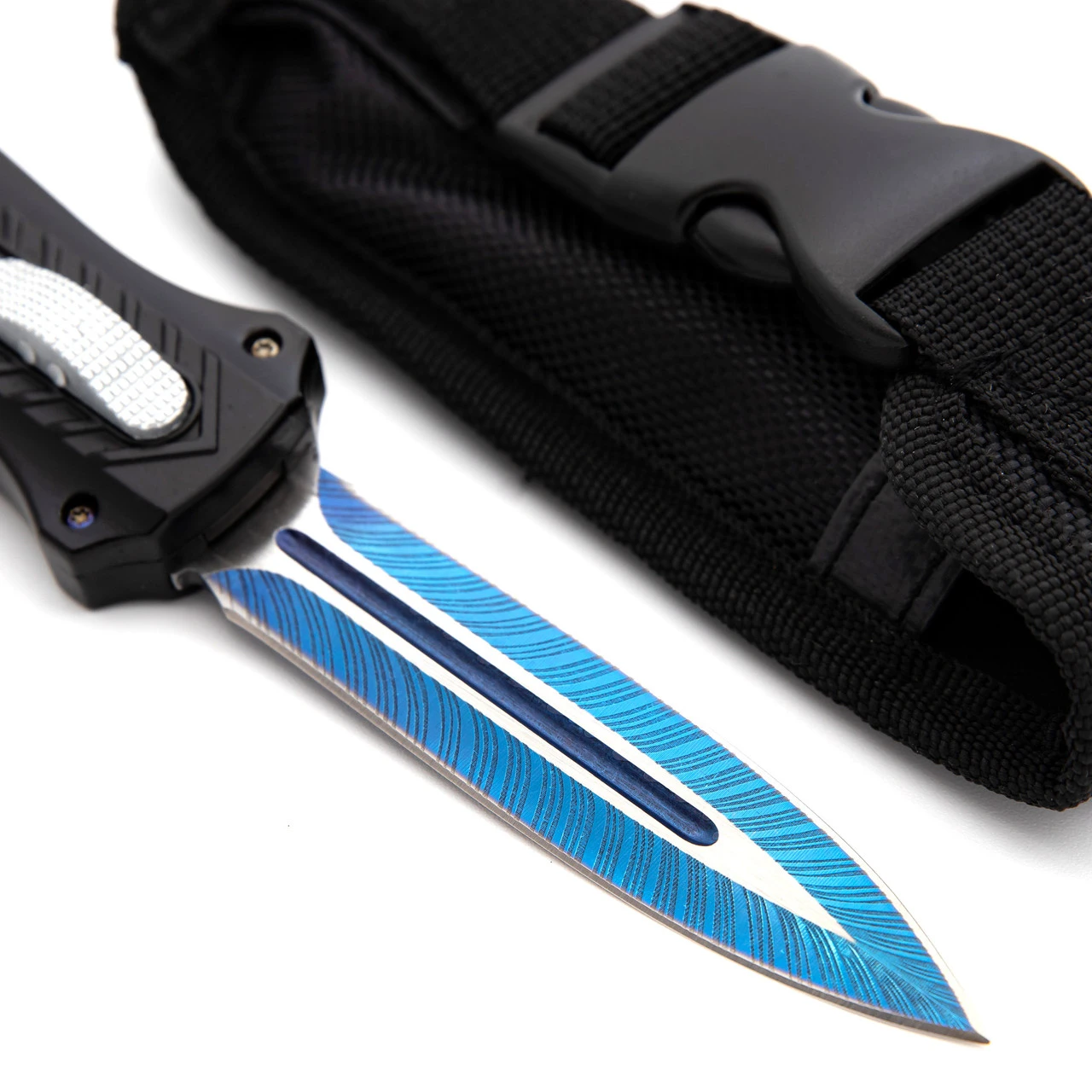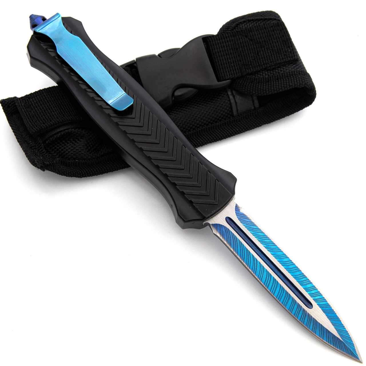 You’ll have ups and downs just like the waves. What they don’t tell you is that sometimes the highs can mimic tidal waves and the lows can cut into the ground like earthquakes. I hope you’re breaking the clouds right now. The On the Rise Automatic OTF is an automatic out the front knife with a gorgeous blue blade, hardware, and belt clip. The stainless-steel blade is textured as if the blue is erupting from the blade itself like a tall wave. Contrasting the blue is the jet black of the aluminum handle and silver center switch. The center switch is easy to use and the contour of the handle maximizes comfort when holding the knife. The On the Rise OTF comes with a black nylon sheath for easy carry and storage so take a deep breath and brace for the waves. Overall Length (Open): 9.5 Inches. Weight: 0.6 lbs.